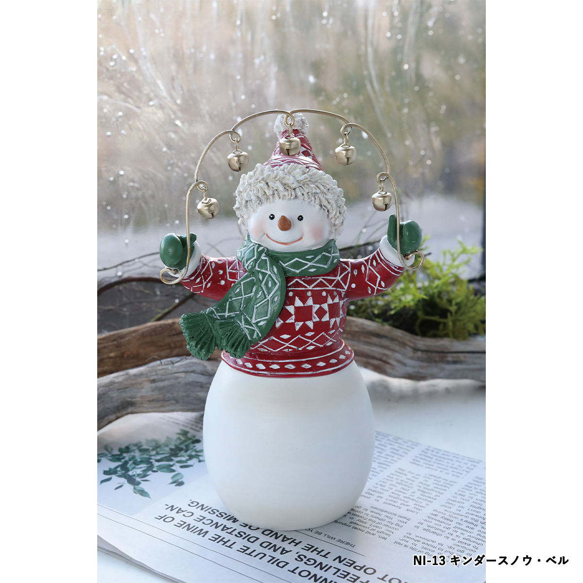 NI-13:ベルを持った雪だるまのポリレジン・スチール製オブジェです。