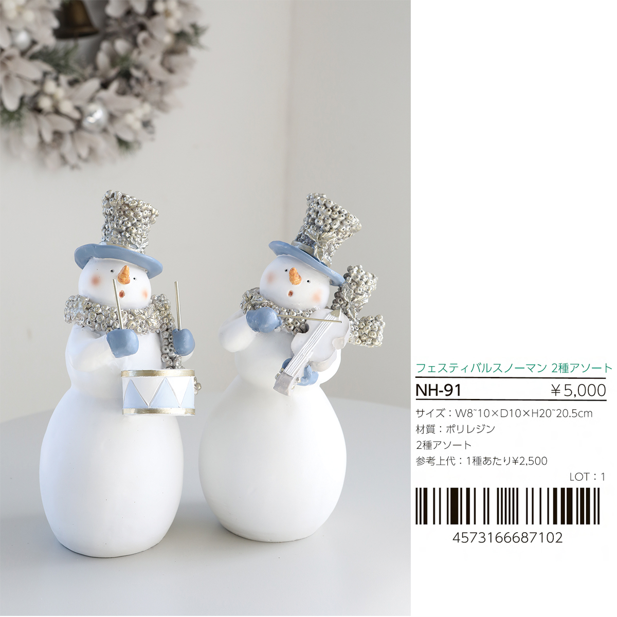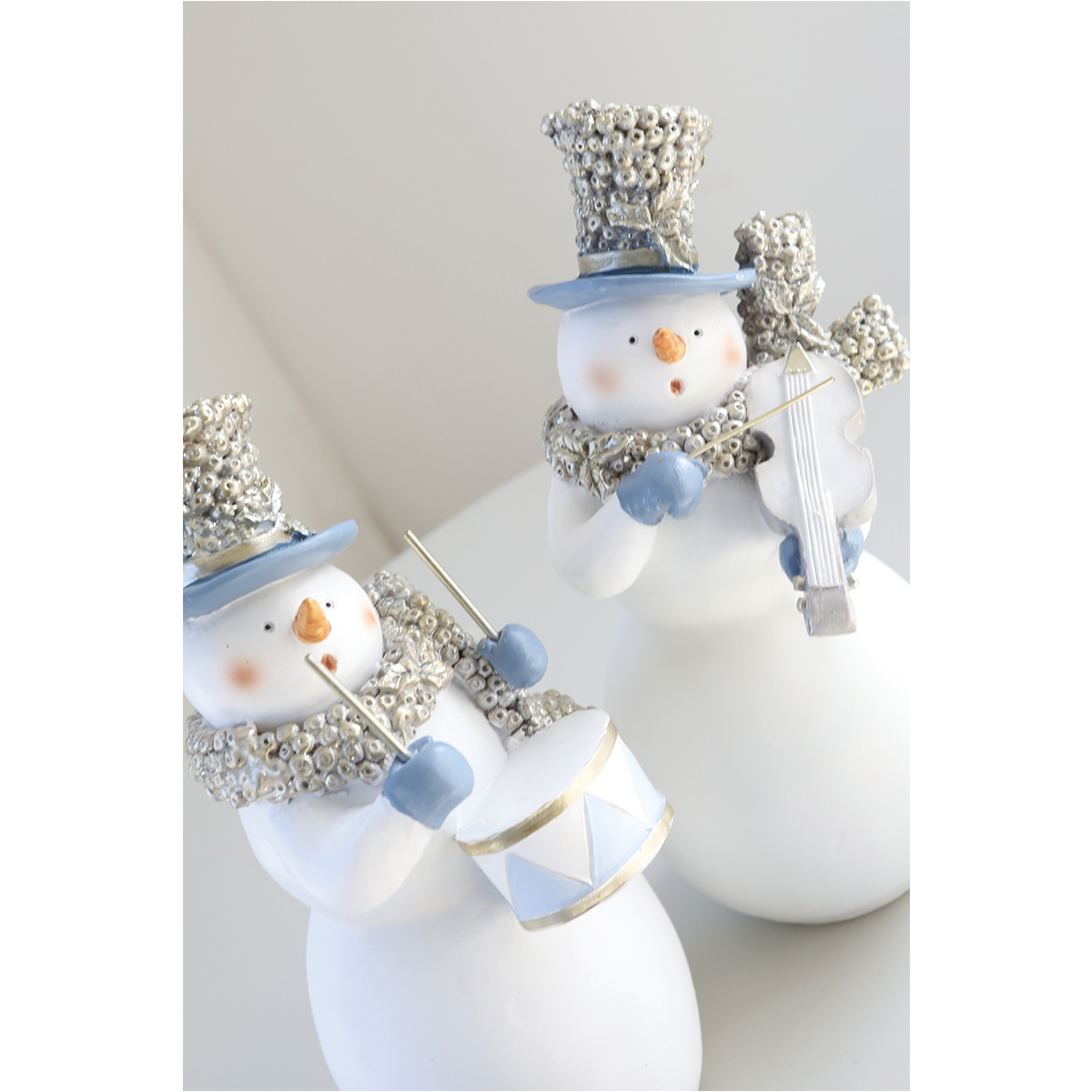 楽器を持ったブルー×ホワイトの雪だるまのポリレジン製オブジェ、2種アソートです。