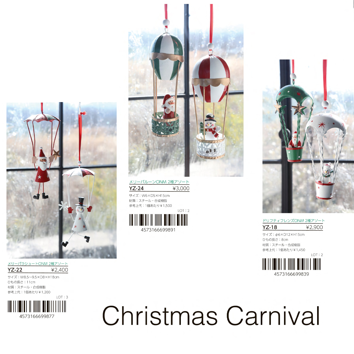 YZ-18:気球型のクリスマスキャラクターオーナメント、2種アソートです。