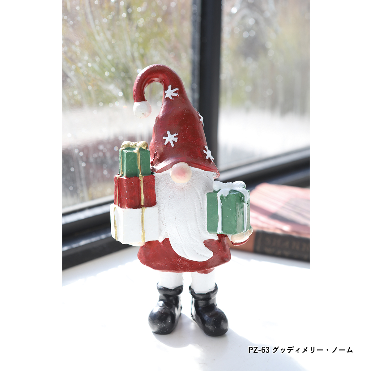 PZ-63:プレゼントを抱えた赤い帽子のノームのポリレジン製オブジェです。