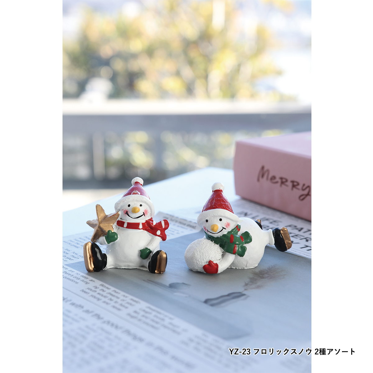 YZ-23:座りポーズの雪だるまの合成樹脂製ミニオブジェ、2種アソートです。
