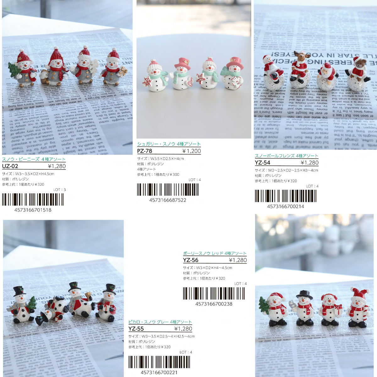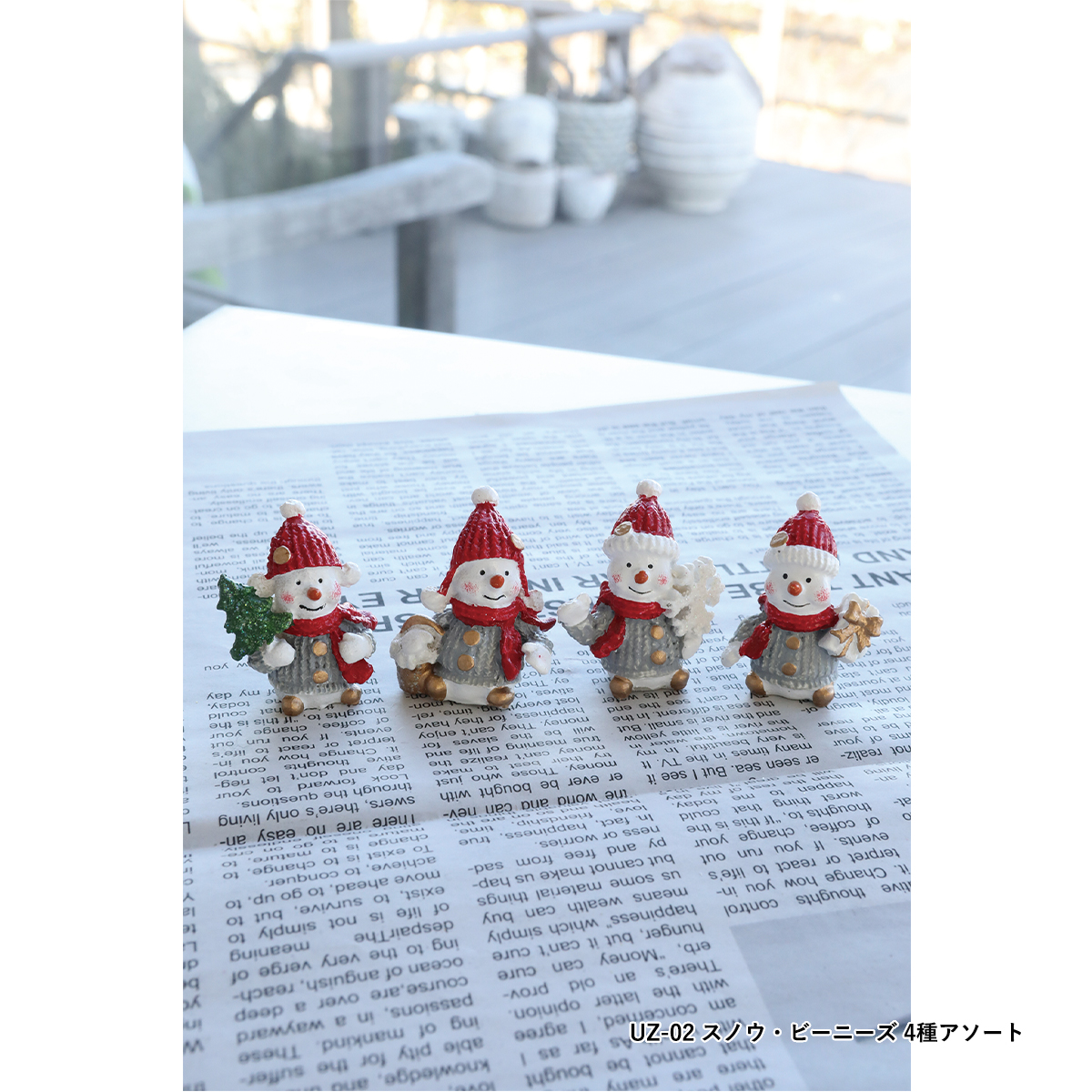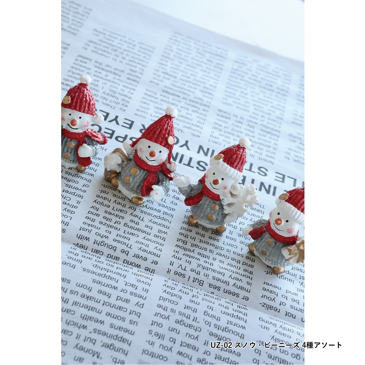 UZ-02:赤い帽子とマフラーの雪だるまのポリレジン製ミニオブジェ、4種アソートです。