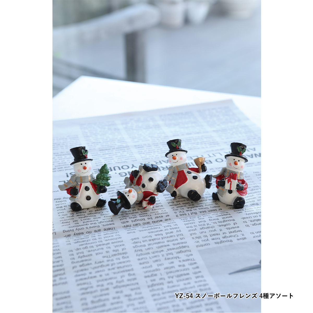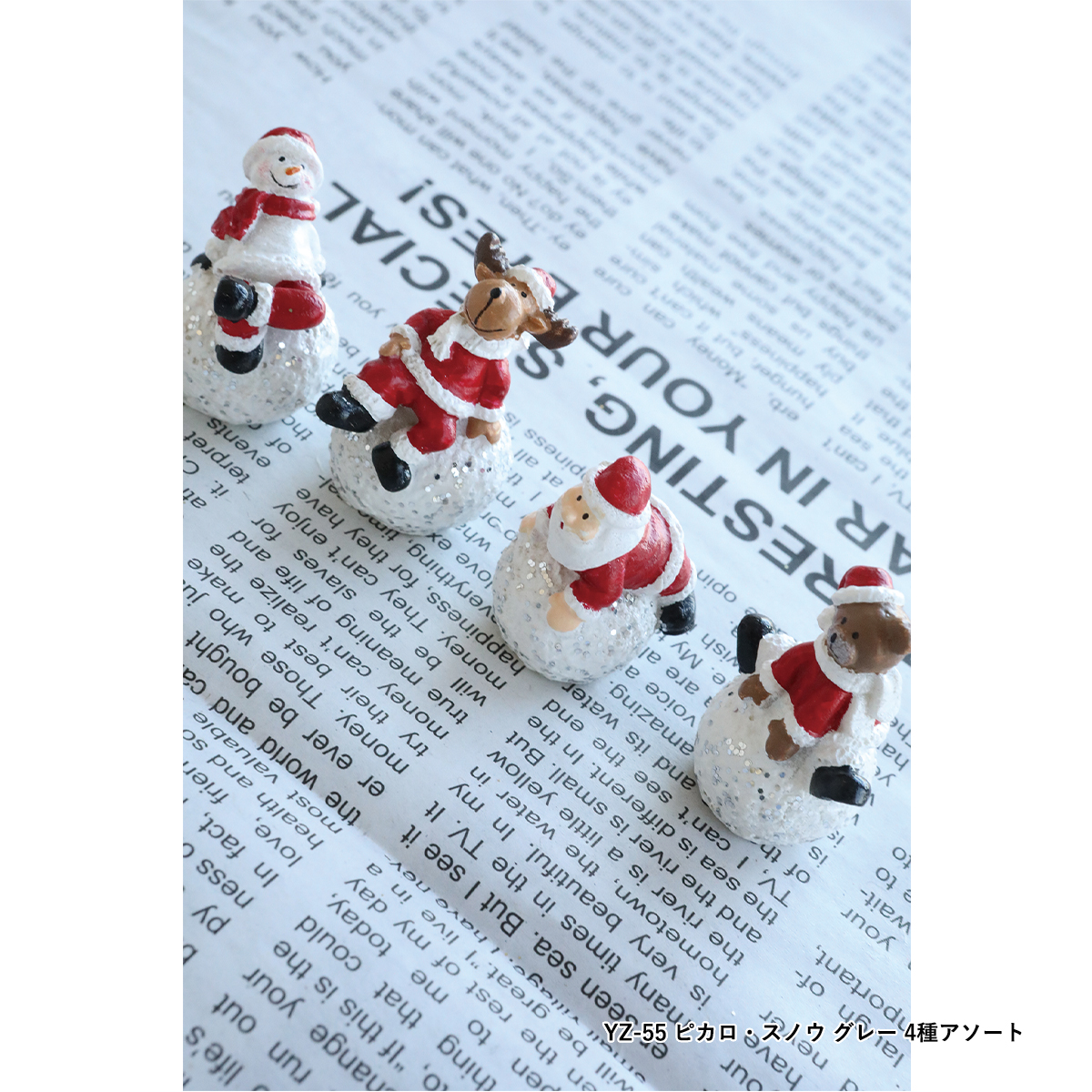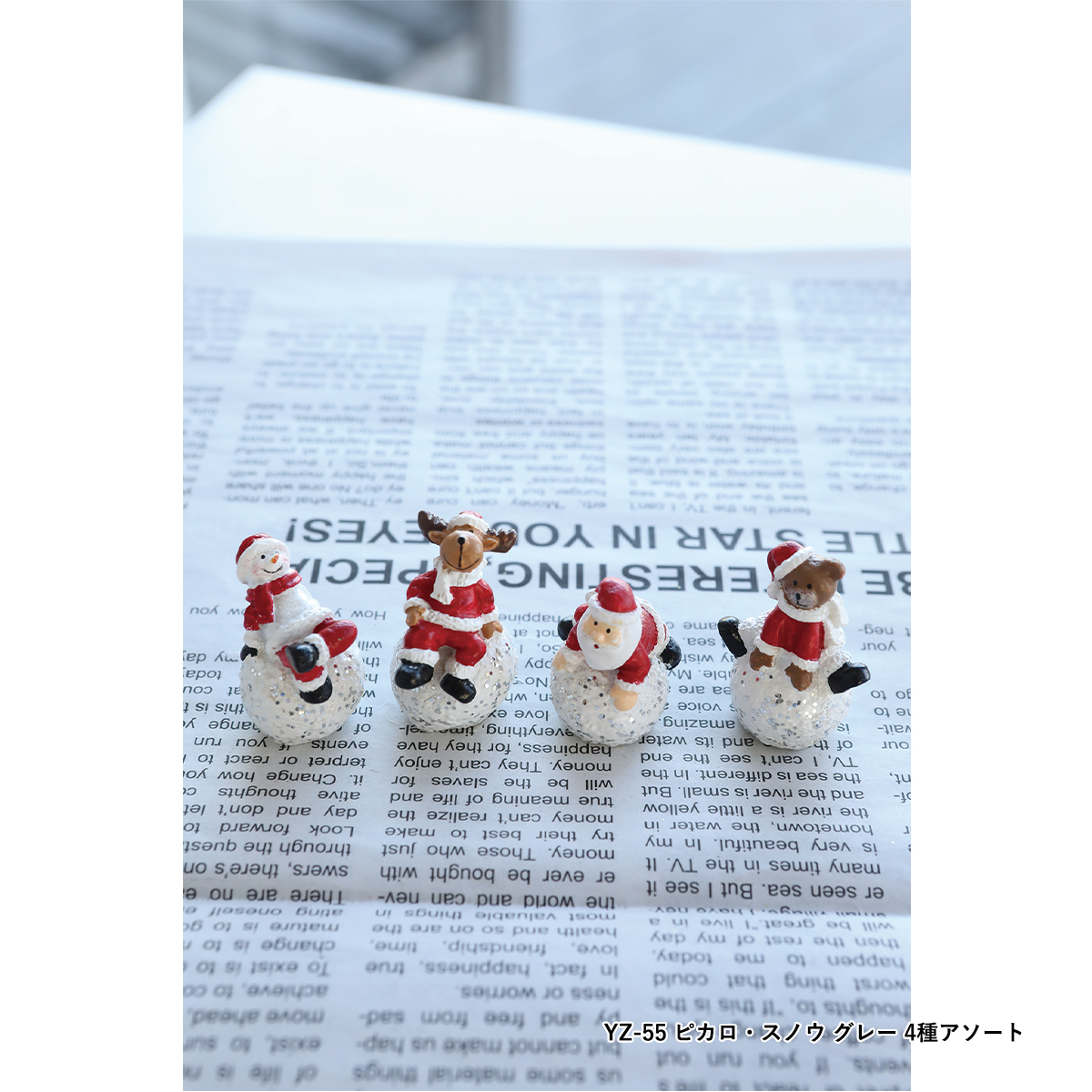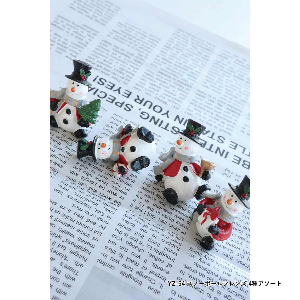 YZ-54:スノーボールに乗ったクリスマスキャラクターのポリレジン製ミニオブジェ、4種アソートです。