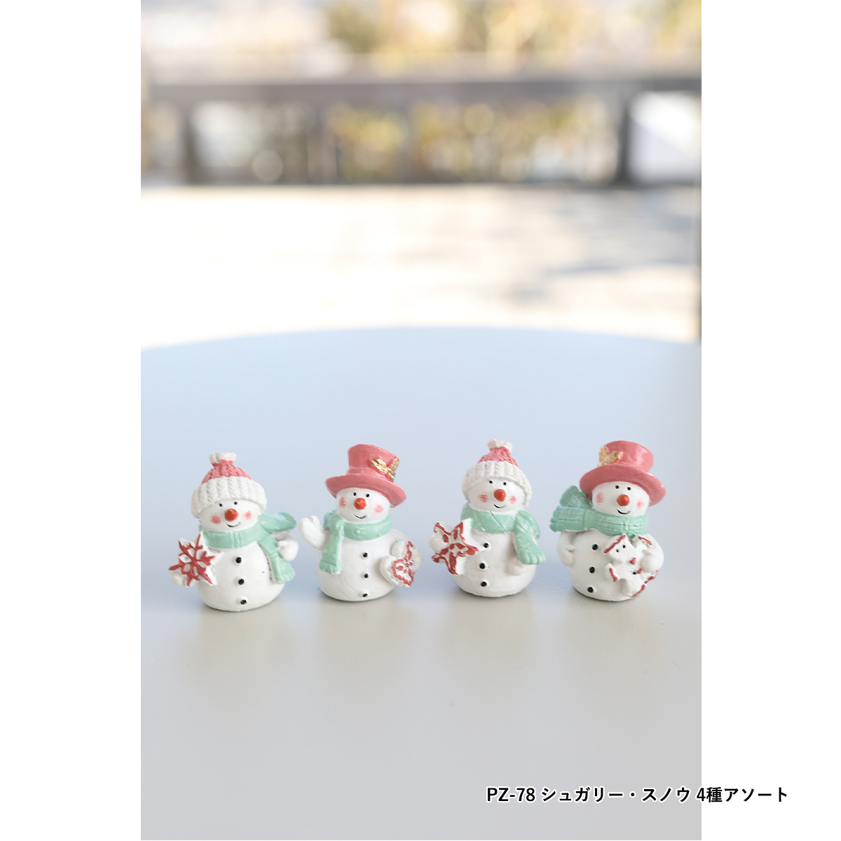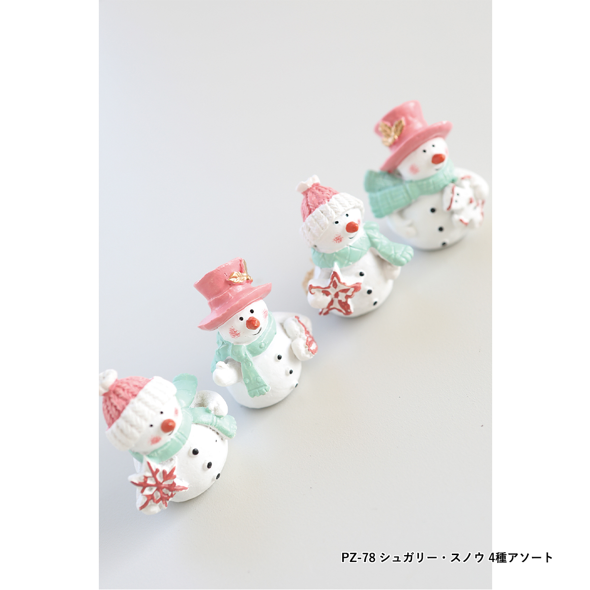 PZ-78:ピンク帽子とグリーンマフラーの雪だるまのポリレジン製ミニオブジェ、4種アソートです。