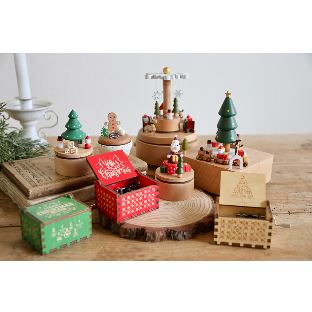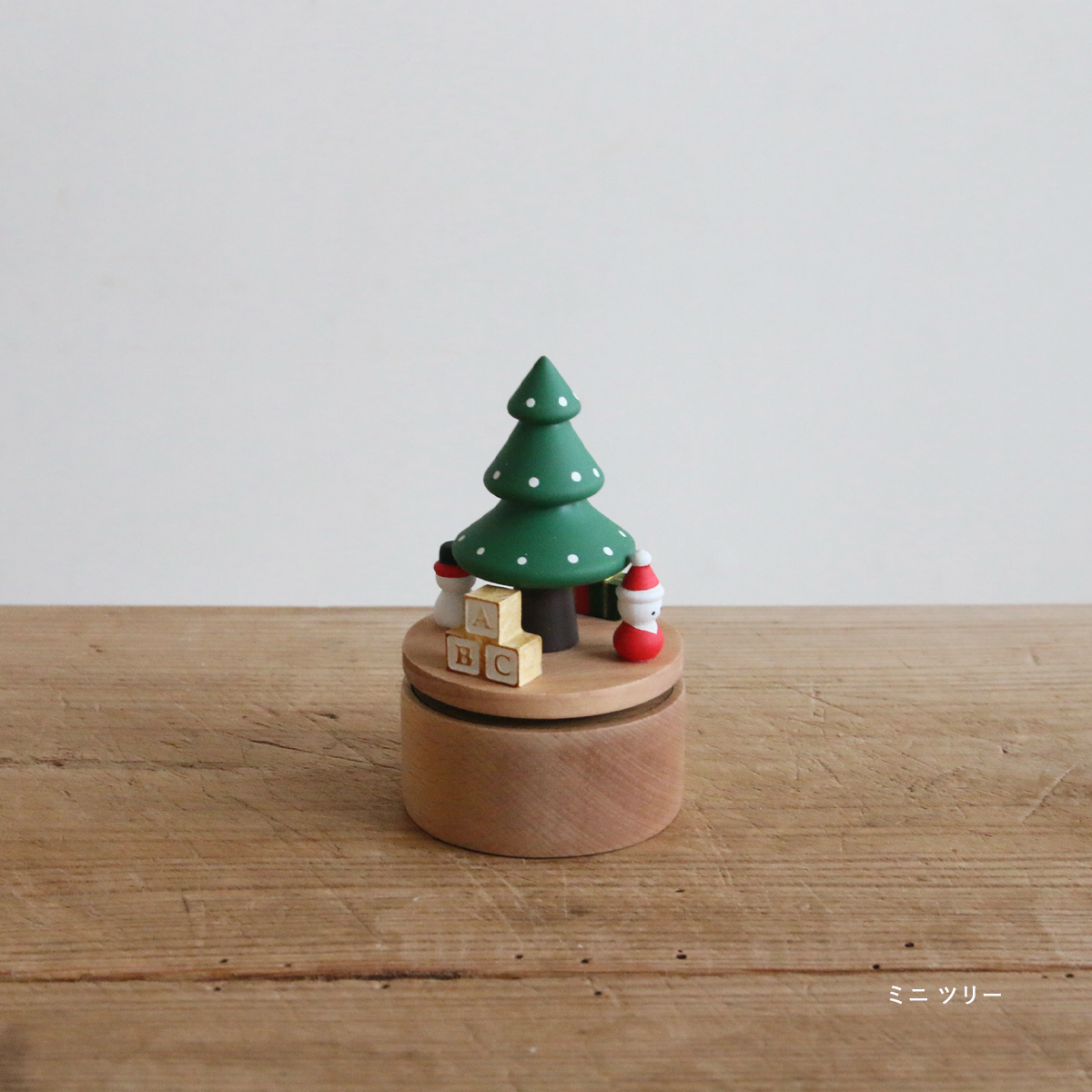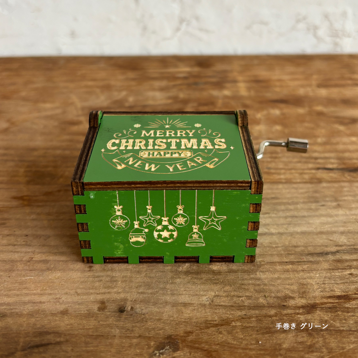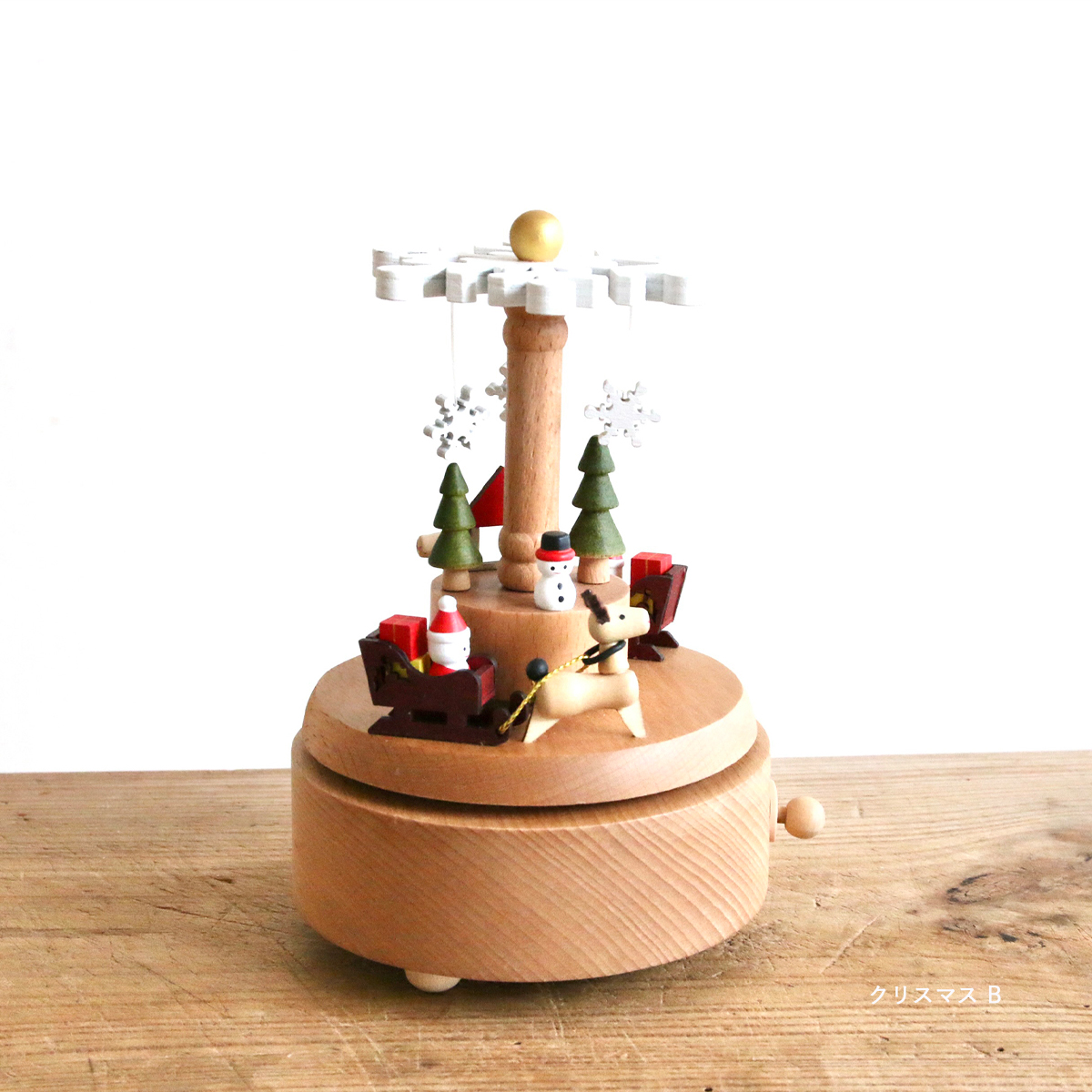 あたたかみのあるゼンマイ式のオルゴールを回すとやさしいクリスマスソングが流れやさしく穏やかな時間を演出。