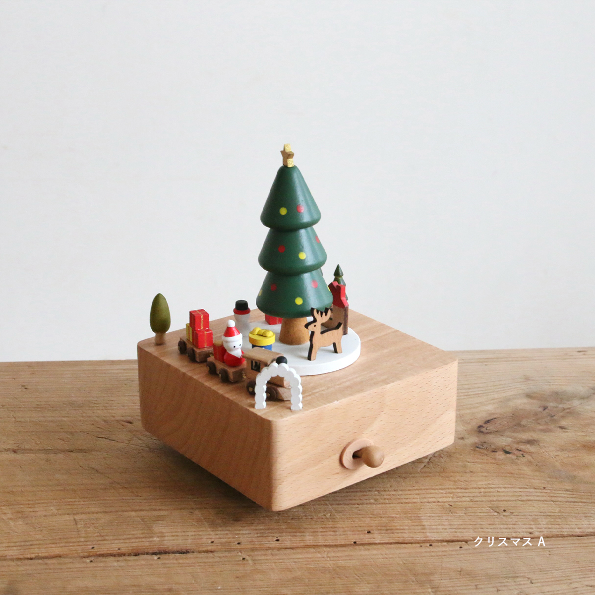 木の温もりを感じる、クリスマスデザインの木製オルゴール。