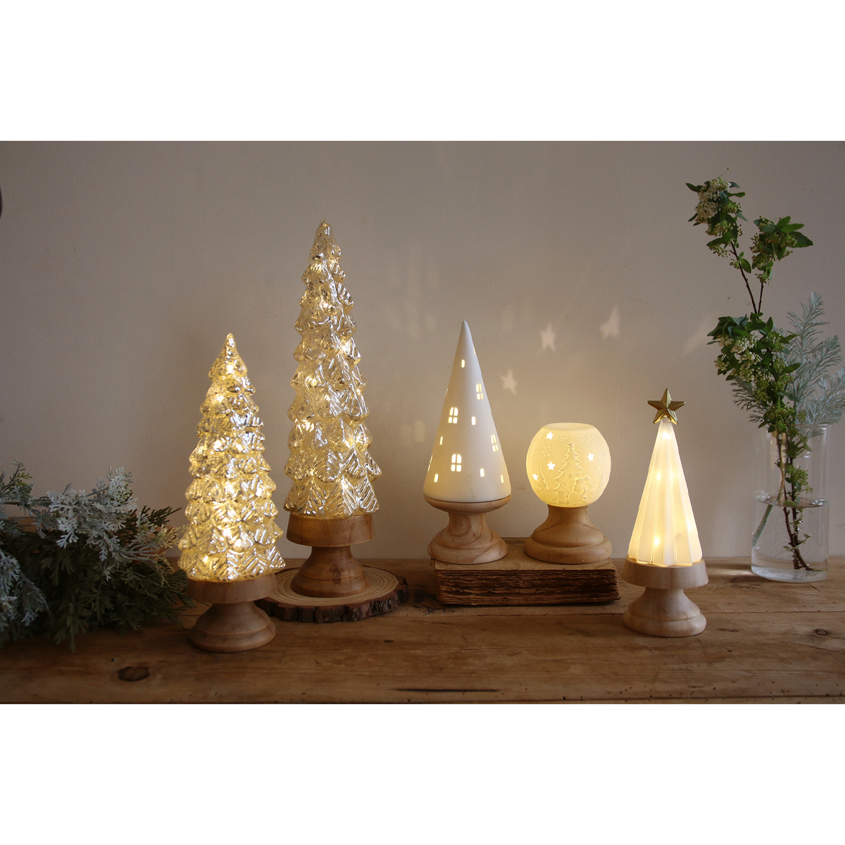 セラミックとウッド、ガラスとウッドの異素材の組み合わせが美しいLEDツリーが、ナチュラルで上品なクリスマス空間を演出します。