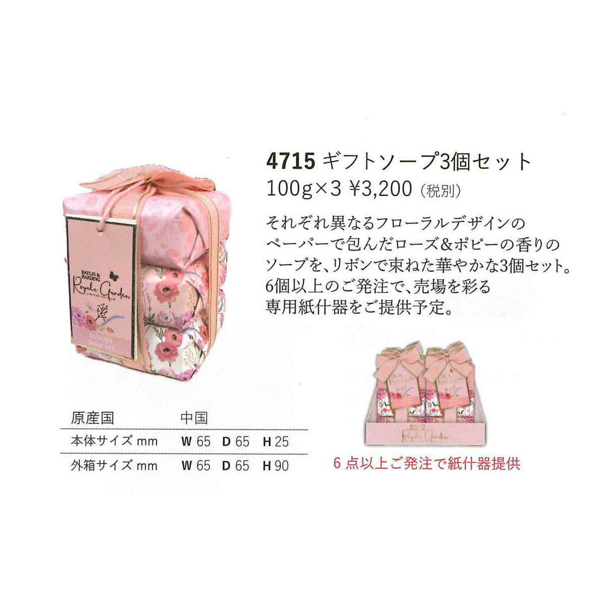 それぞれ異なるフローラルデザインの ペーパーで包んだローズ&ポピーの香りのソープを、リボンで束ねた華やかな3個セット。6個以上のご発注で、売場を彩る 専用紙什器をご提供できます。