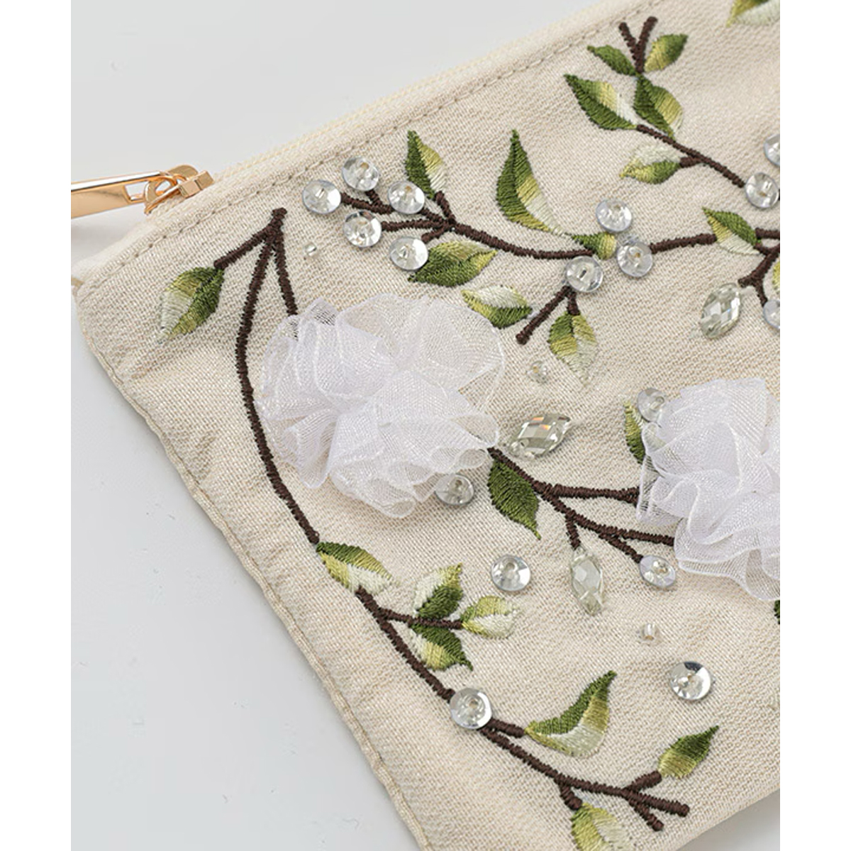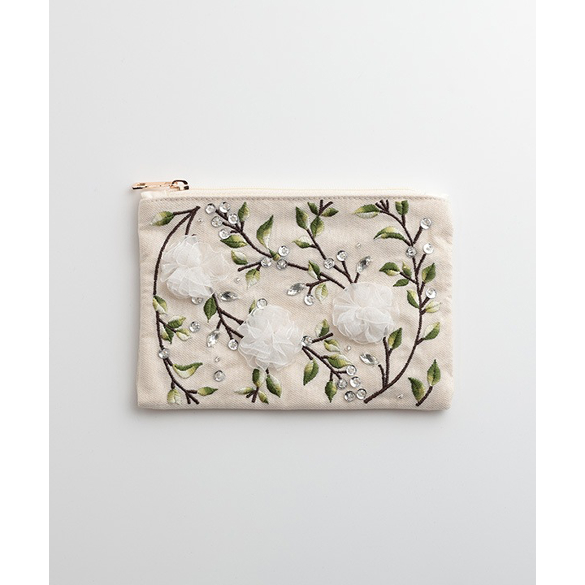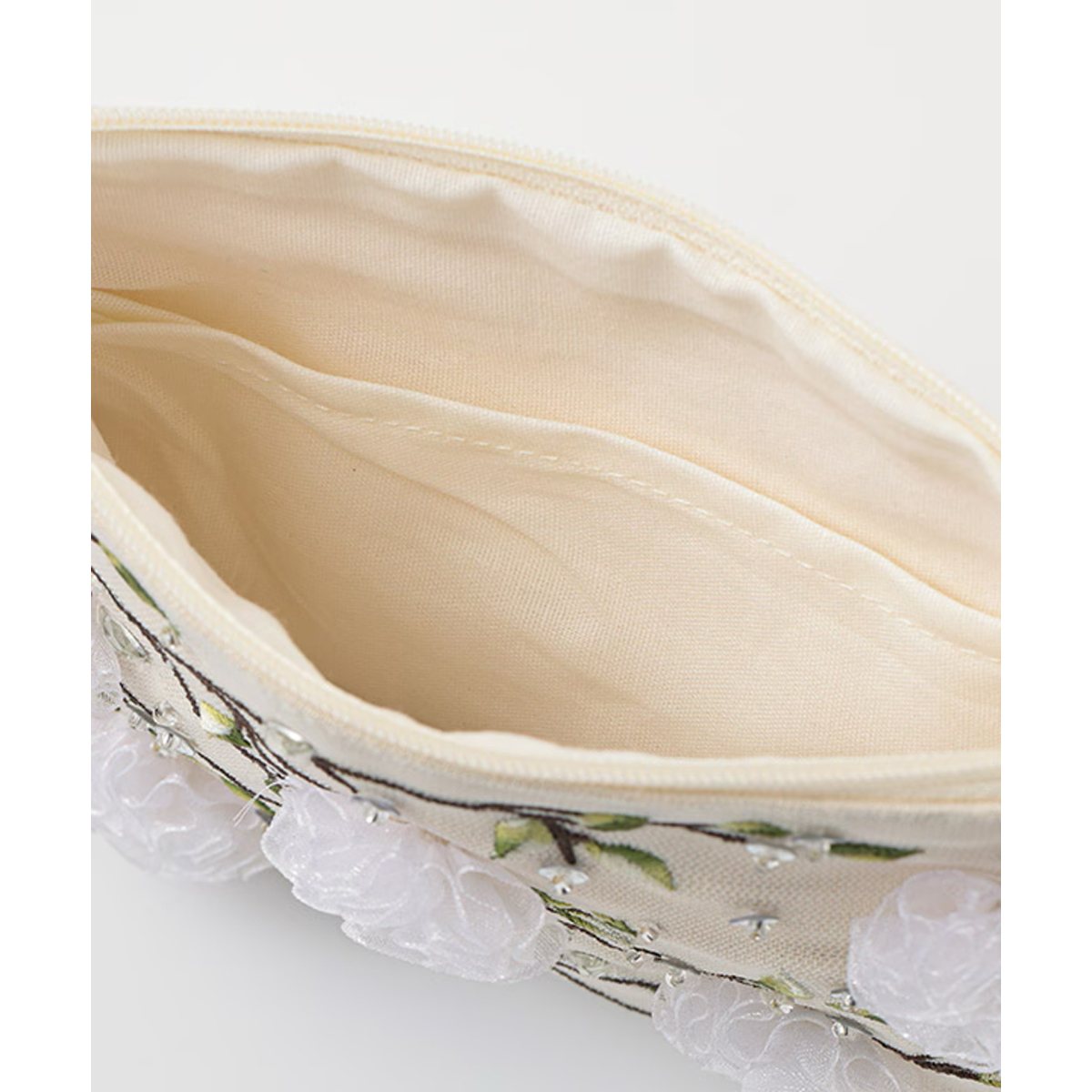 リボンフラワー刺繍ポーチは、ベースにレースを使用し、優しく女性らしい印象に仕上げました。レースを立体的に刺繍し、お花に見立てたデザインが華やかさを添えています。