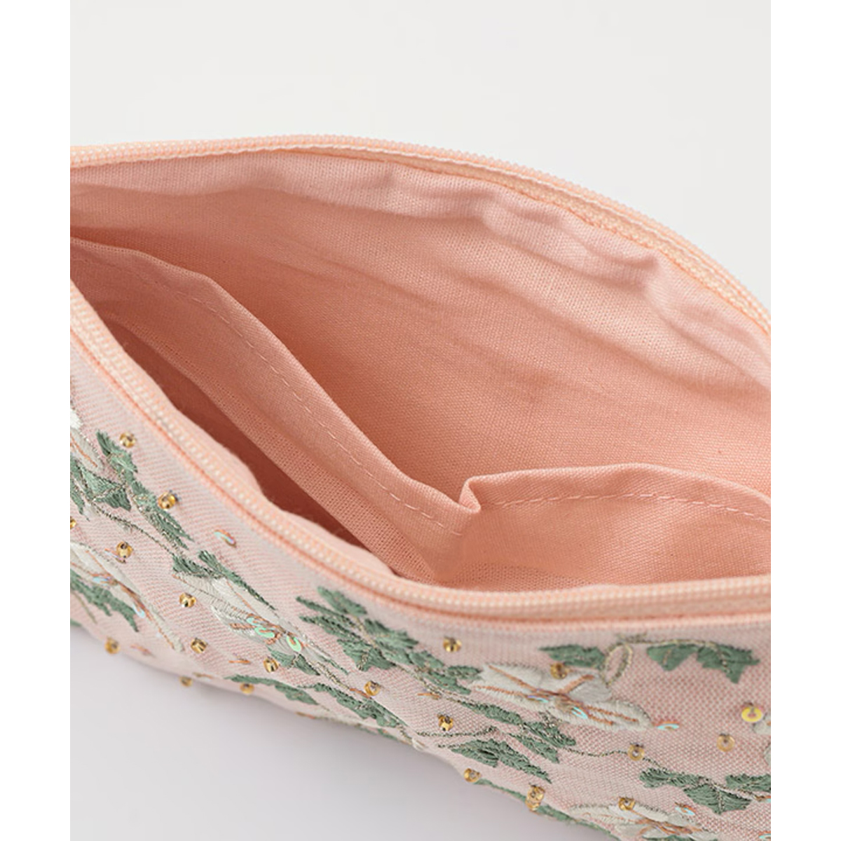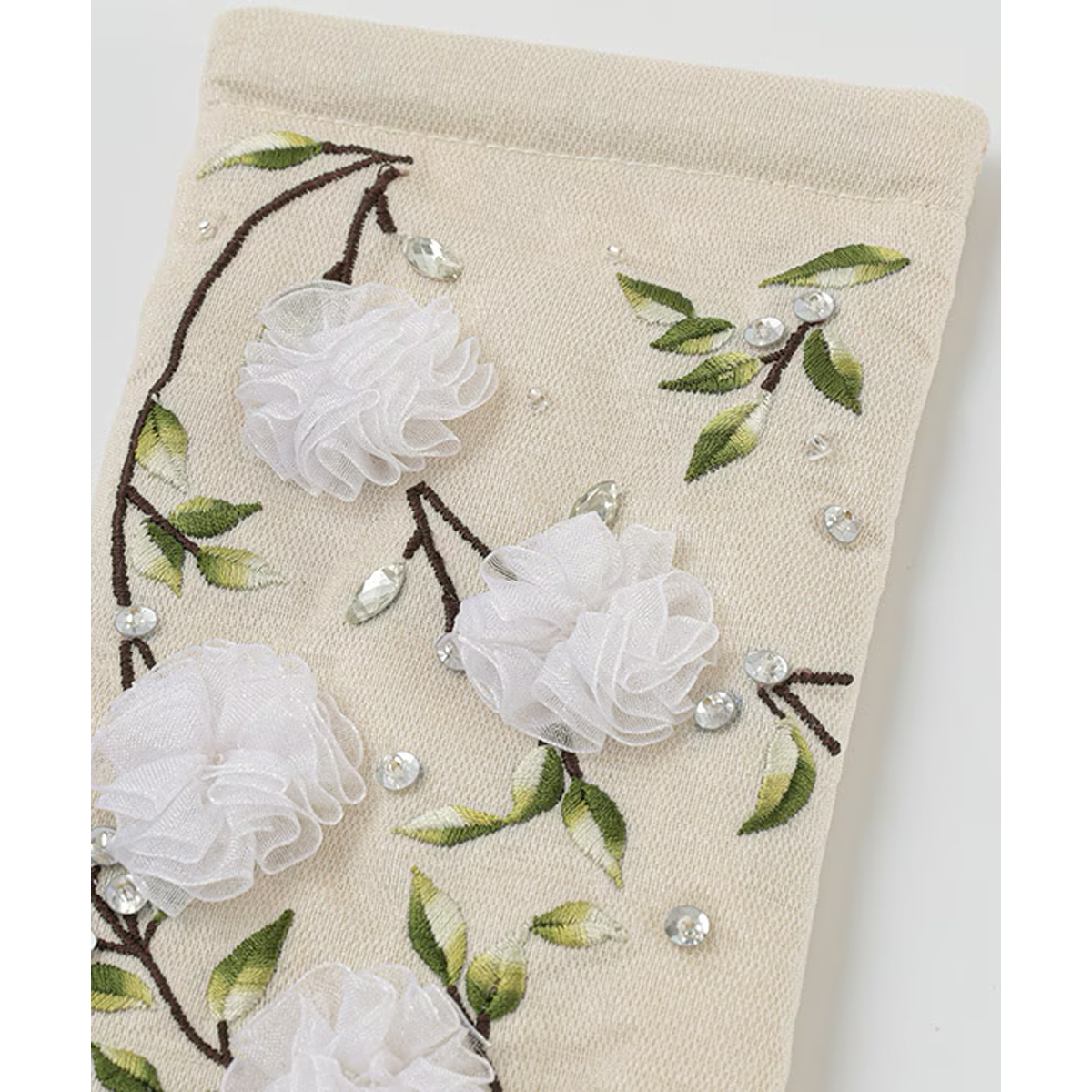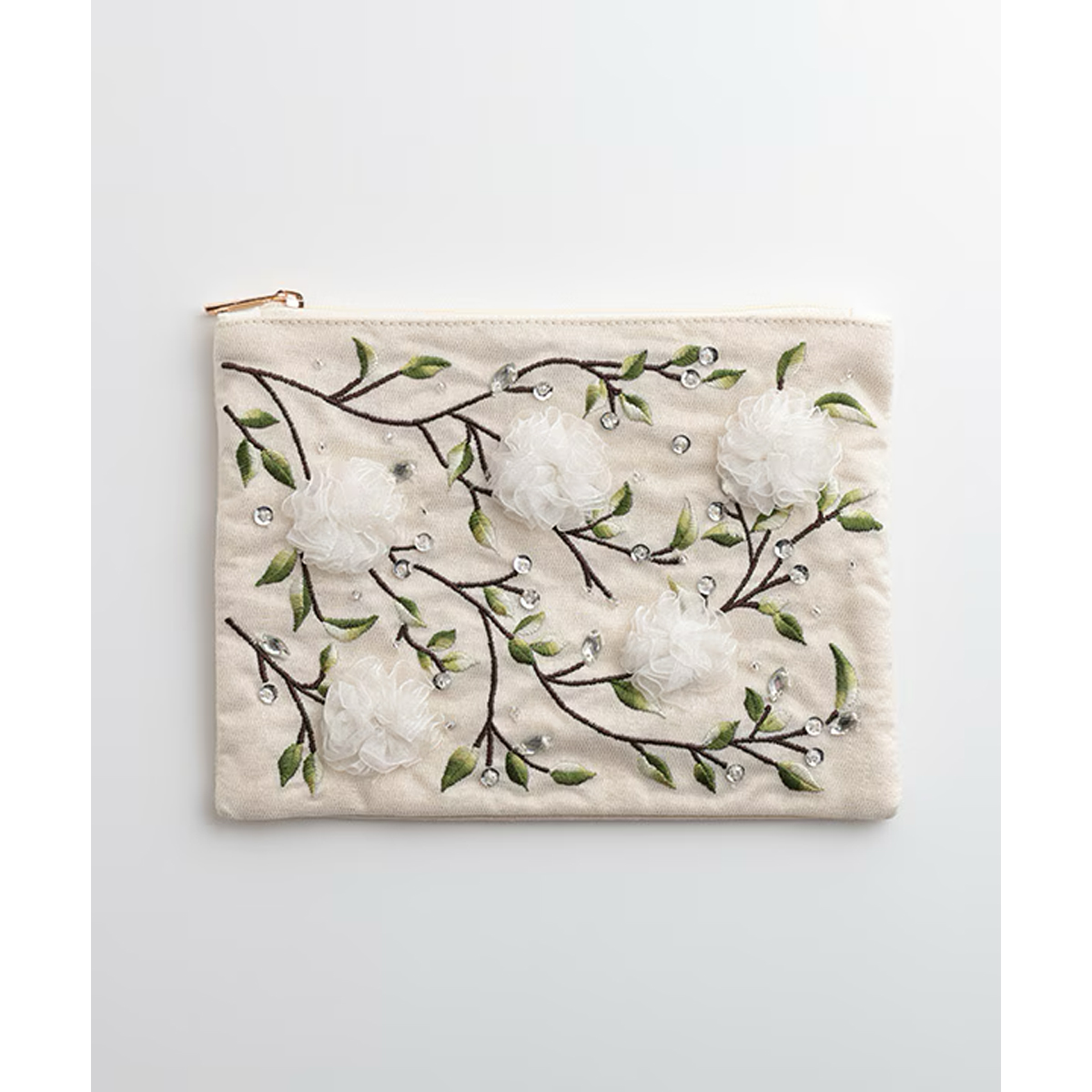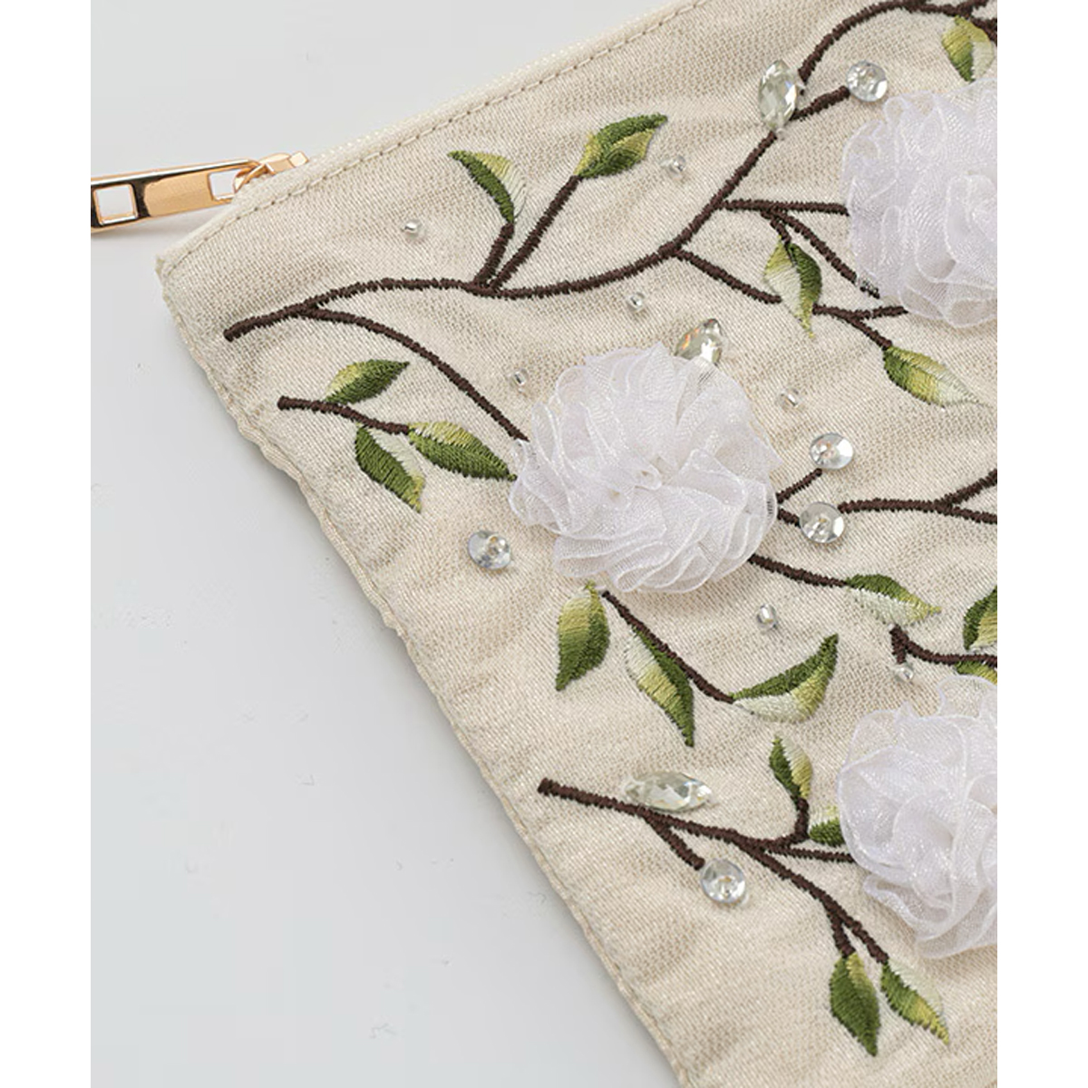 リボンフラワー刺繍ポーチは、ベースにレースを使用し、優しく女性らしい印象に仕上げました。レースを立体的に刺繍し、お花に見立てたデザインが華やかさを添えています。
