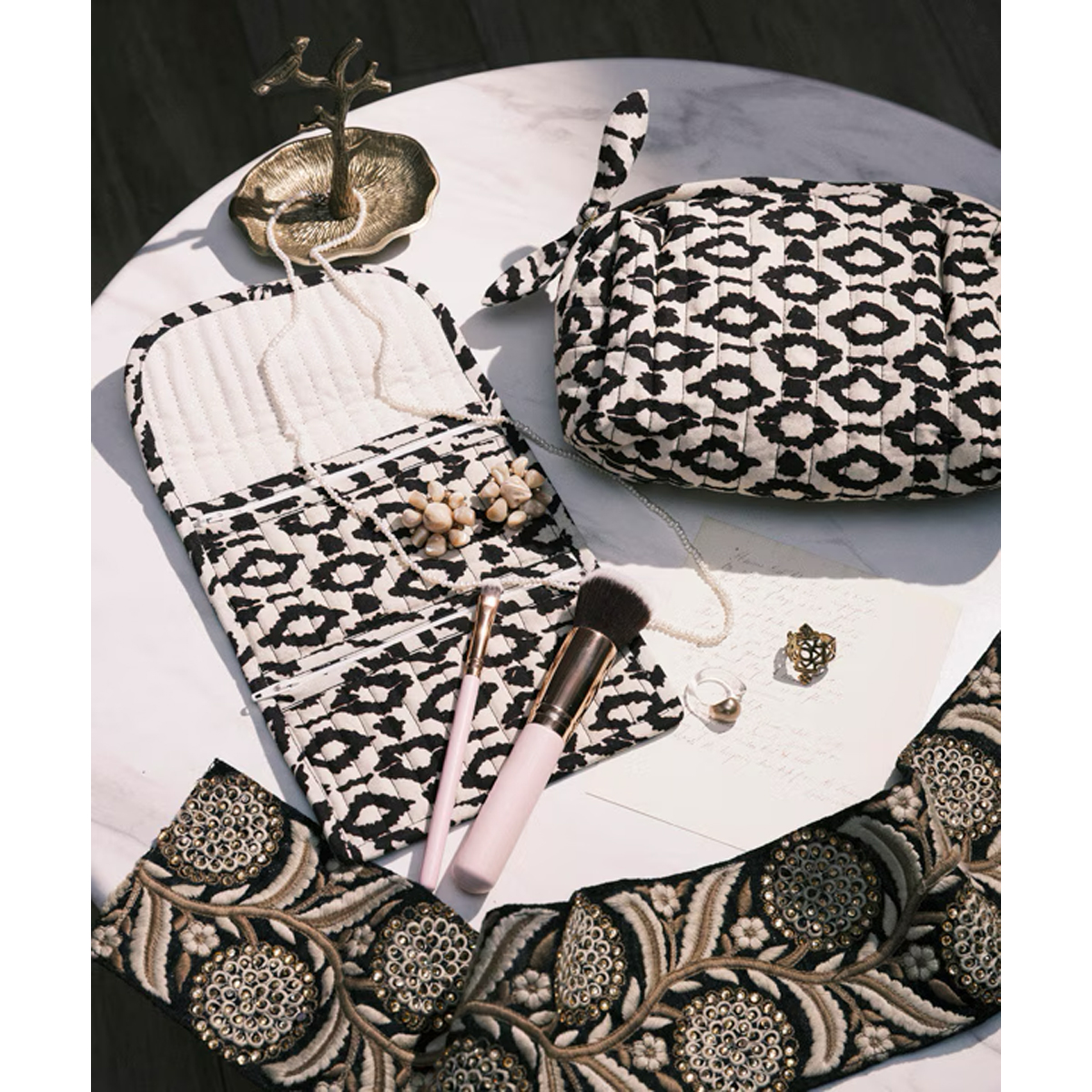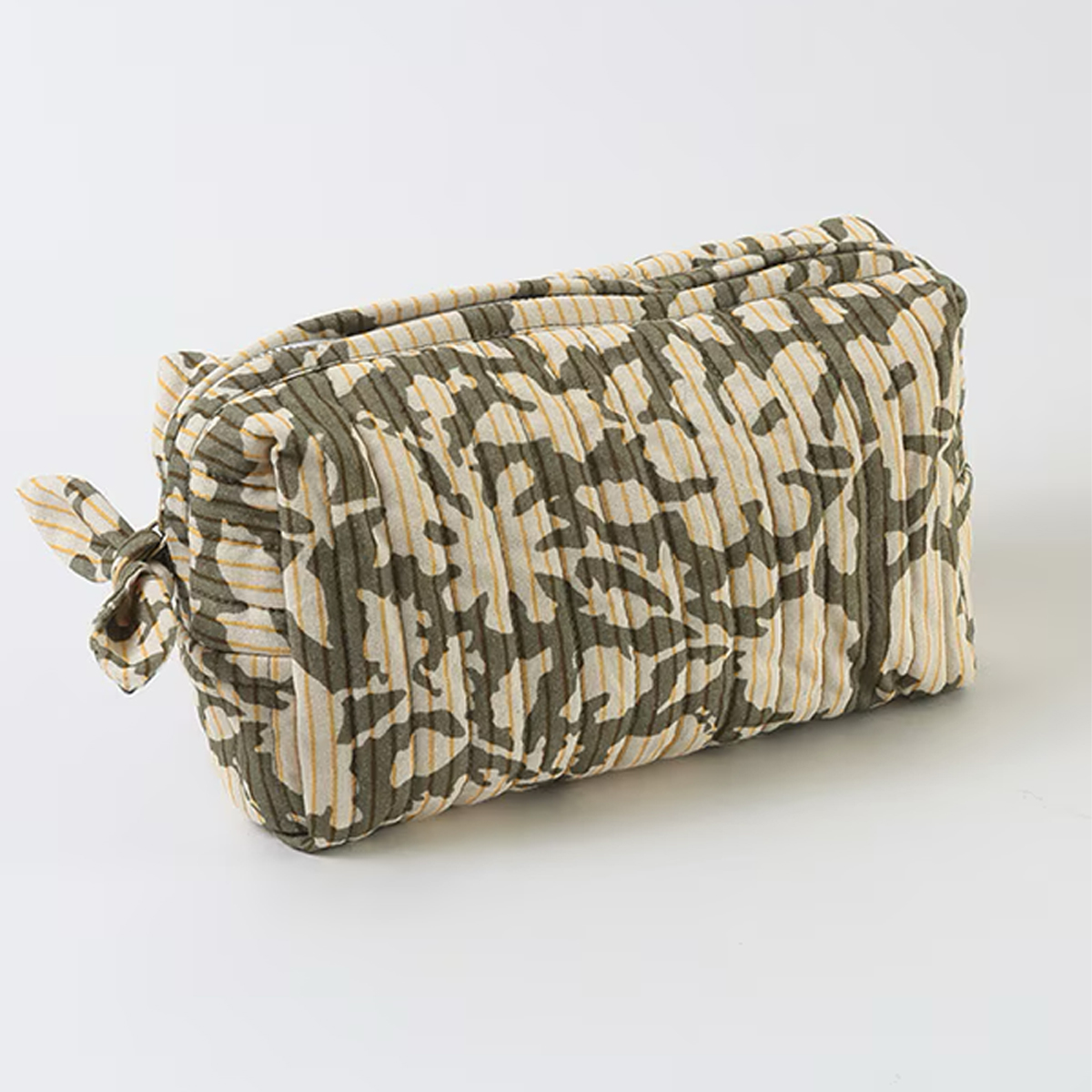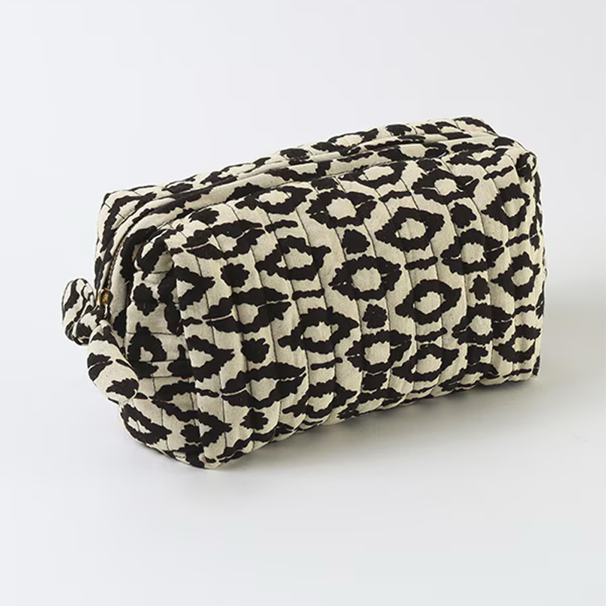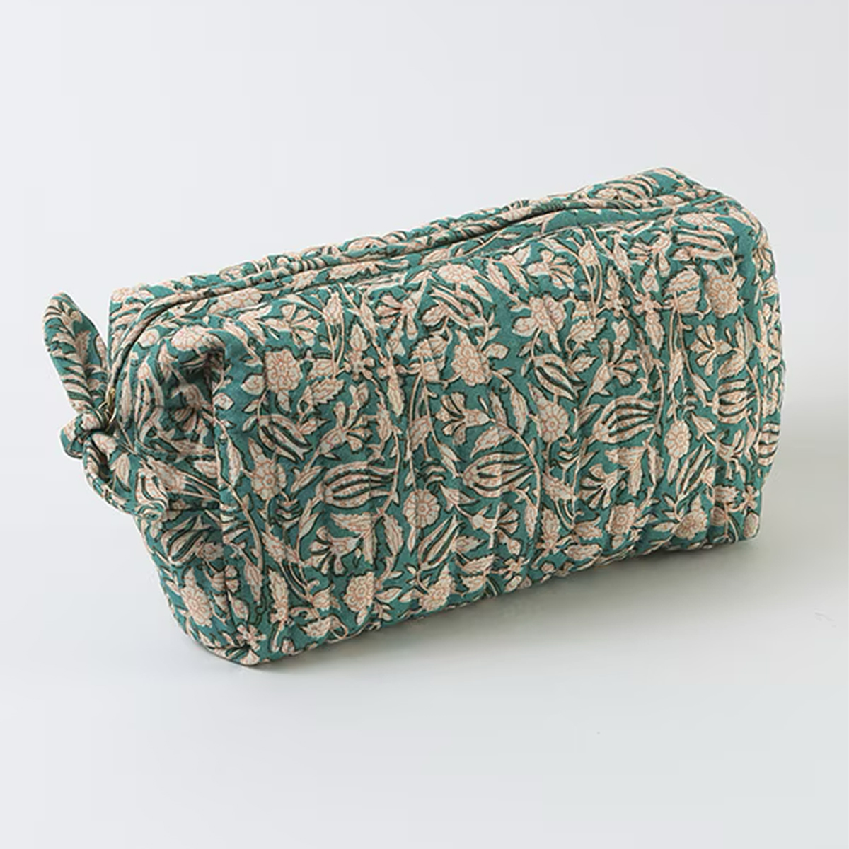 手彫りの木版でプリントされた柔らかなインド綿に、ふっくらとキルティングを施したブロックプリントのポーチシリーズ。