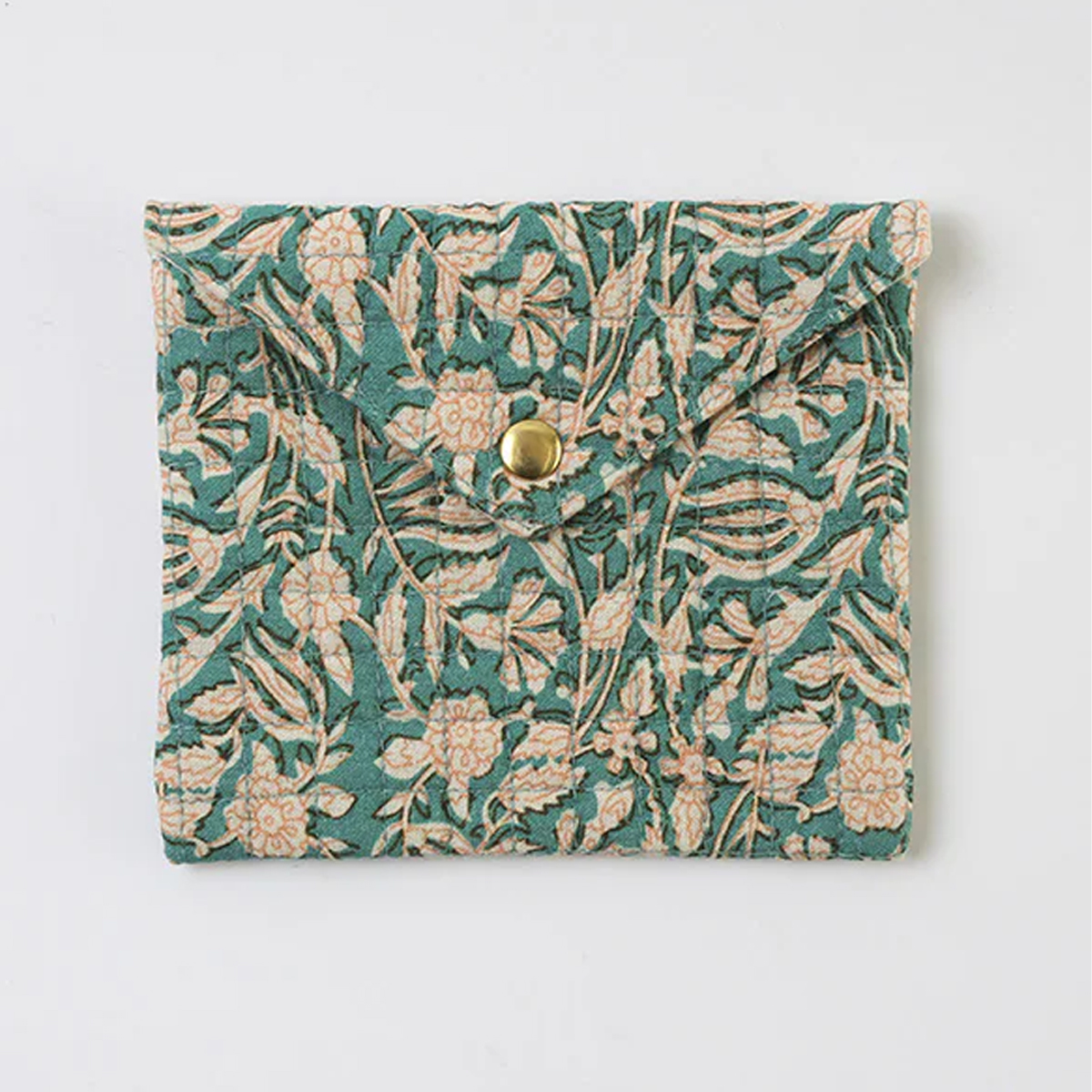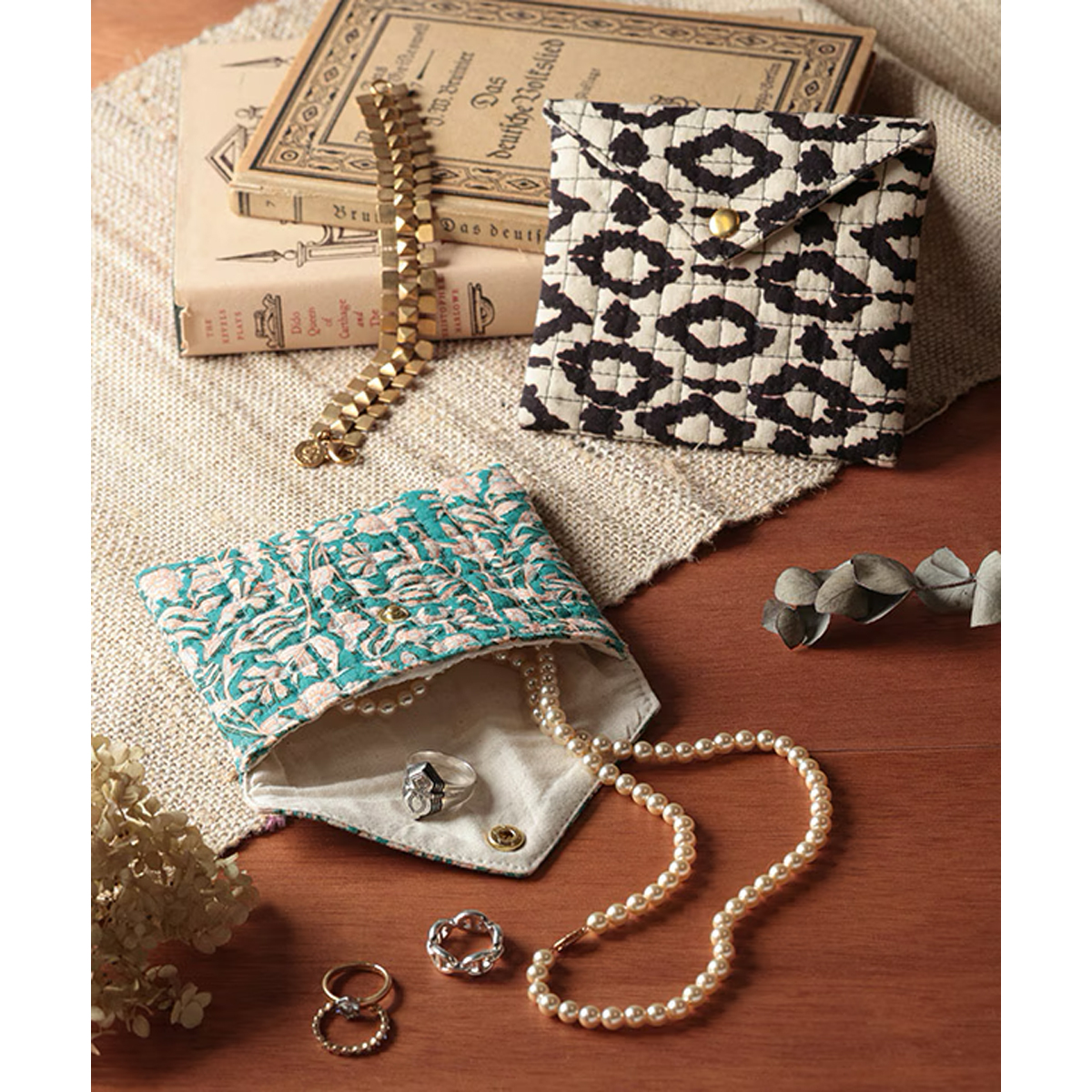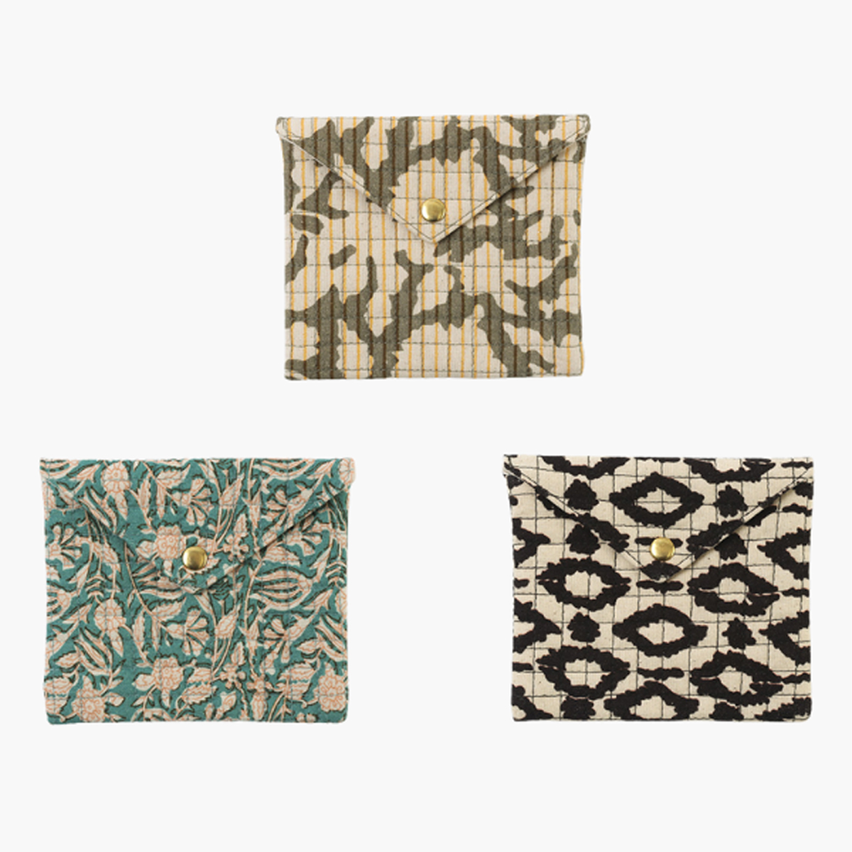 手彫りの木版でプリントされた柔らかなインド綿に、ふっくらとキルティングを施したブロックプリントのポーチシリーズ。