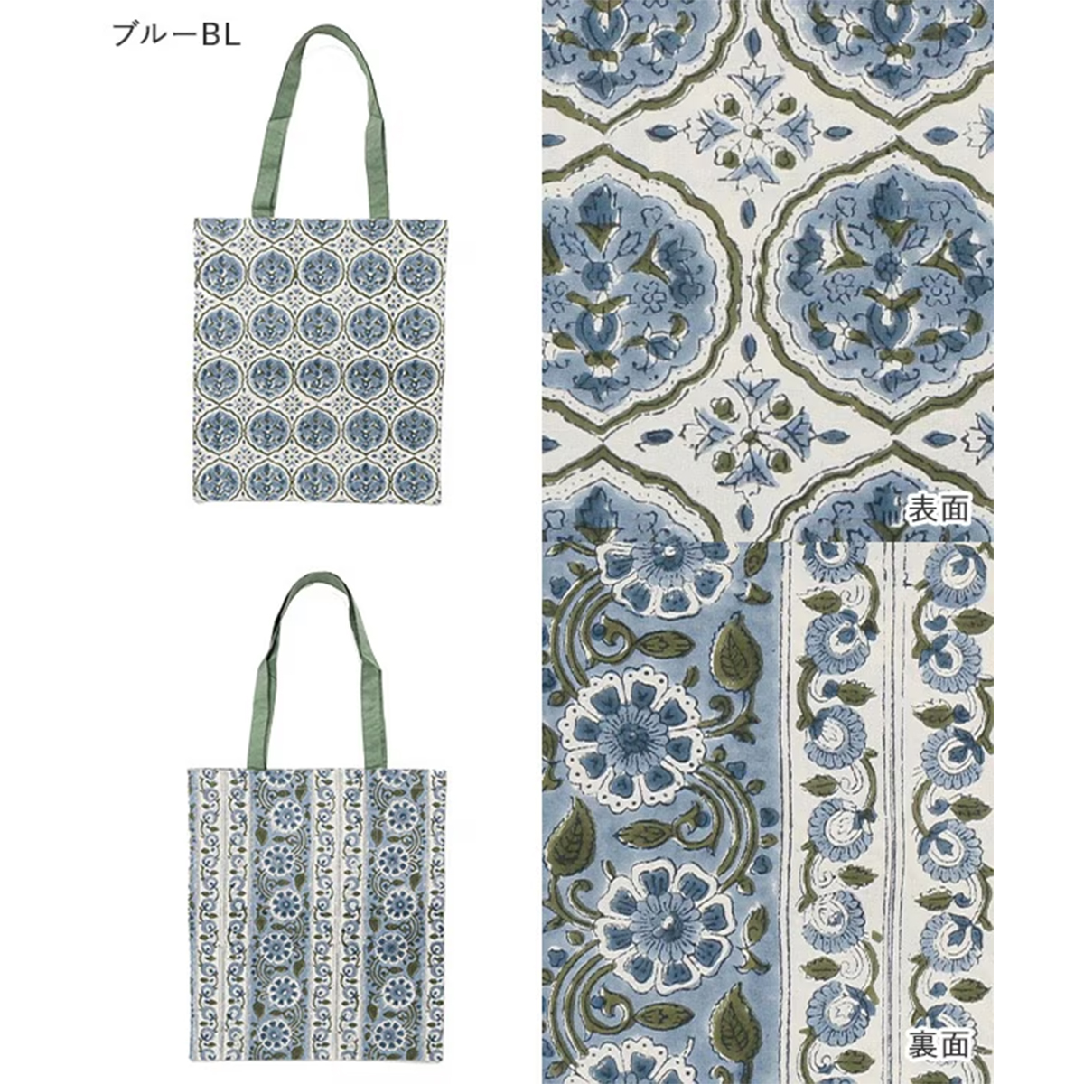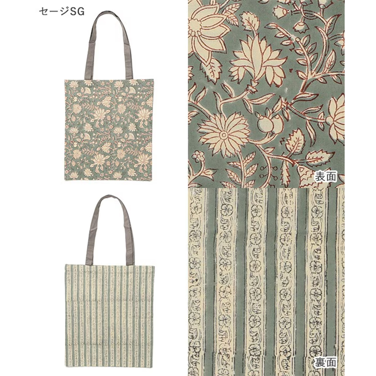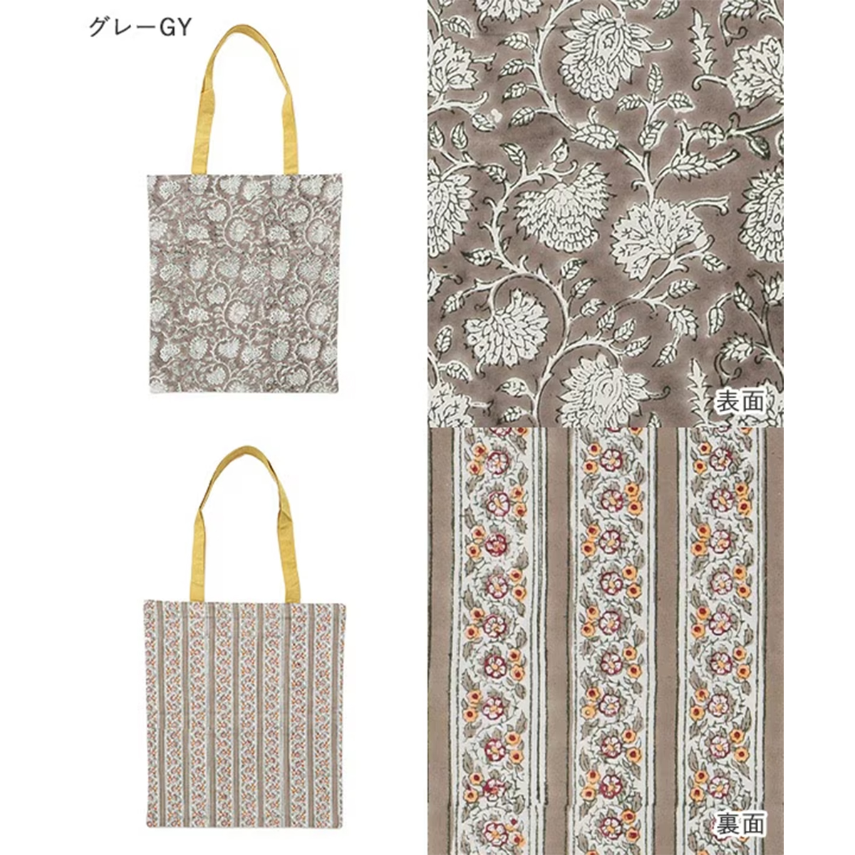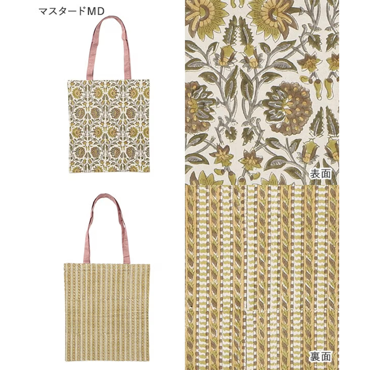 今期はお部屋のインテリアにも馴染みやすい落ち着いた色味を基調としながら、無地の配色がアクセントになったデザインになっています。両面で異なる柄を使ったトートバッグ。取っ手部分の色使いにもこだわっています。生地は薄めに作ってあるので、いざという時用に畳んでバッグにいれておいても邪魔になりません。エコバッグとして使ってみるのもおすすめです。