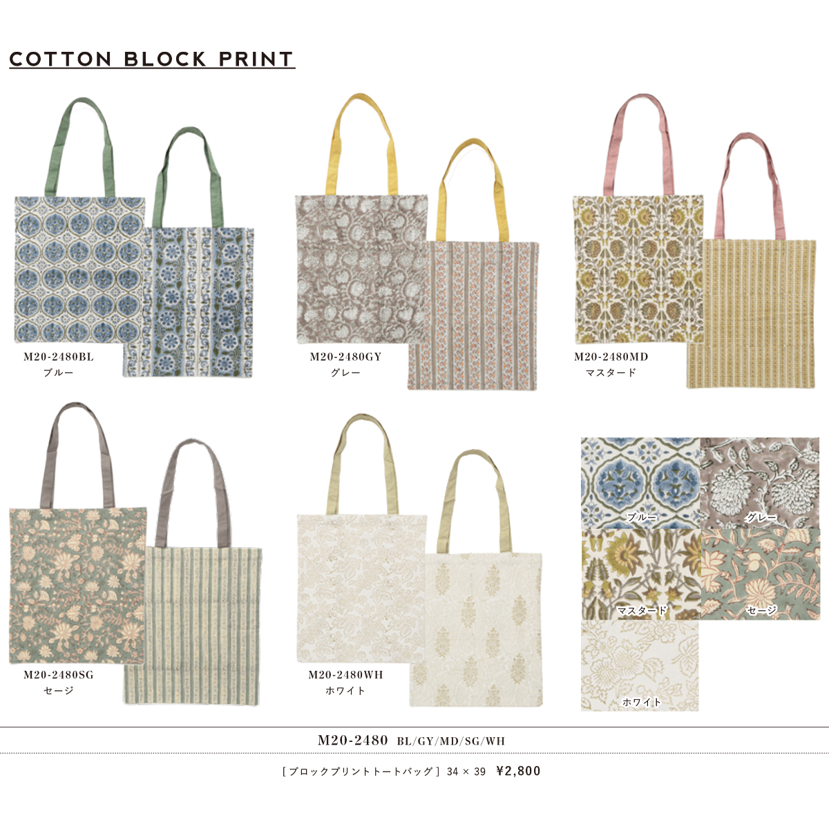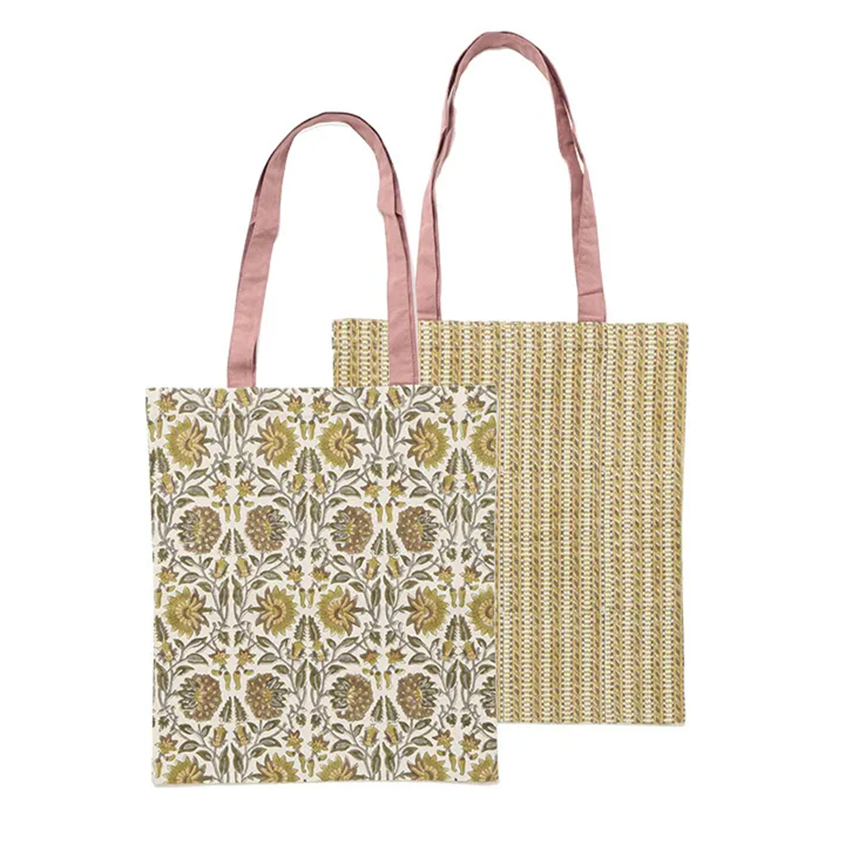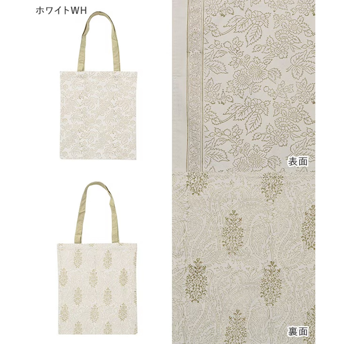 今期はお部屋のインテリアにも馴染みやすい落ち着いた色味を基調としながら、無地の配色がアクセントになったデザインになっています。両面で異なる柄を使ったトートバッグ。取っ手部分の色使いにもこだわっています。生地は薄めに作ってあるので、いざという時用に畳んでバッグにいれておいても邪魔になりません。エコバッグとして使ってみるのもおすすめです。