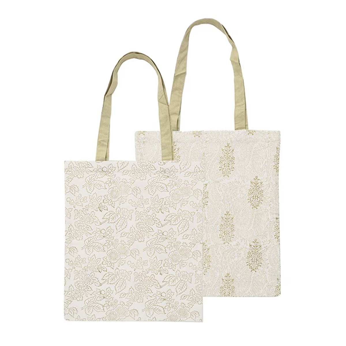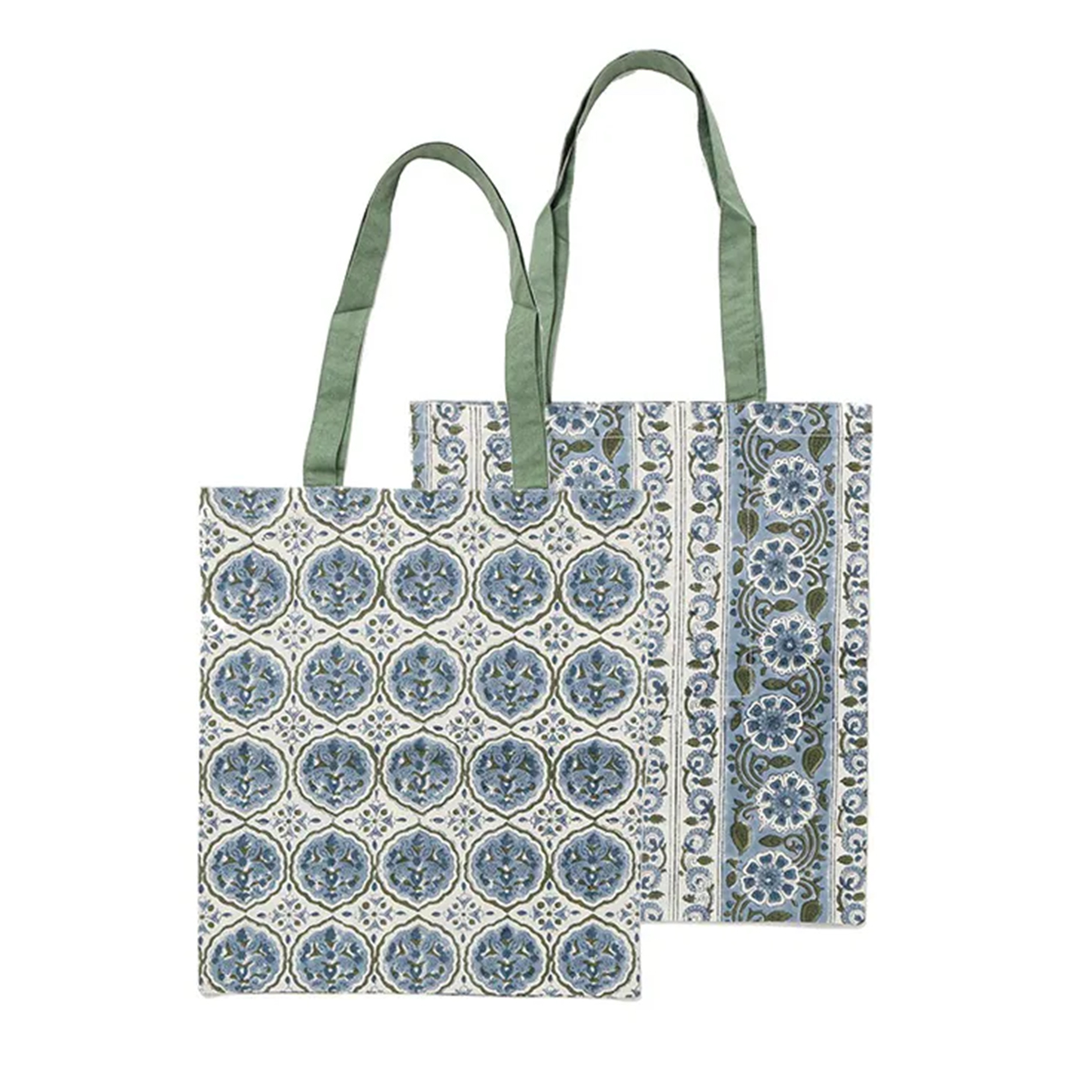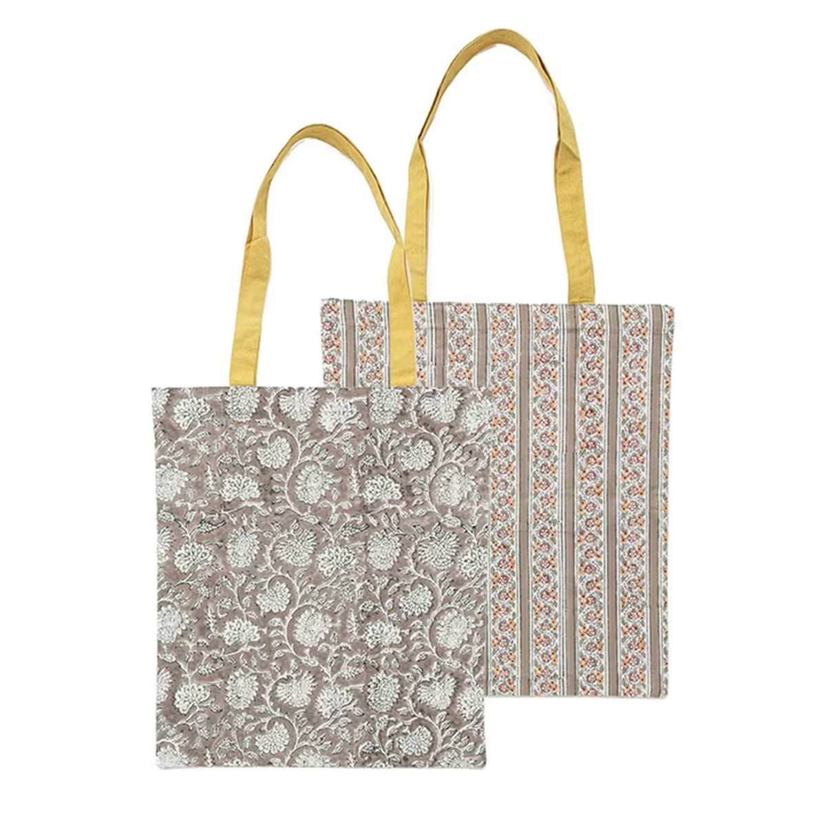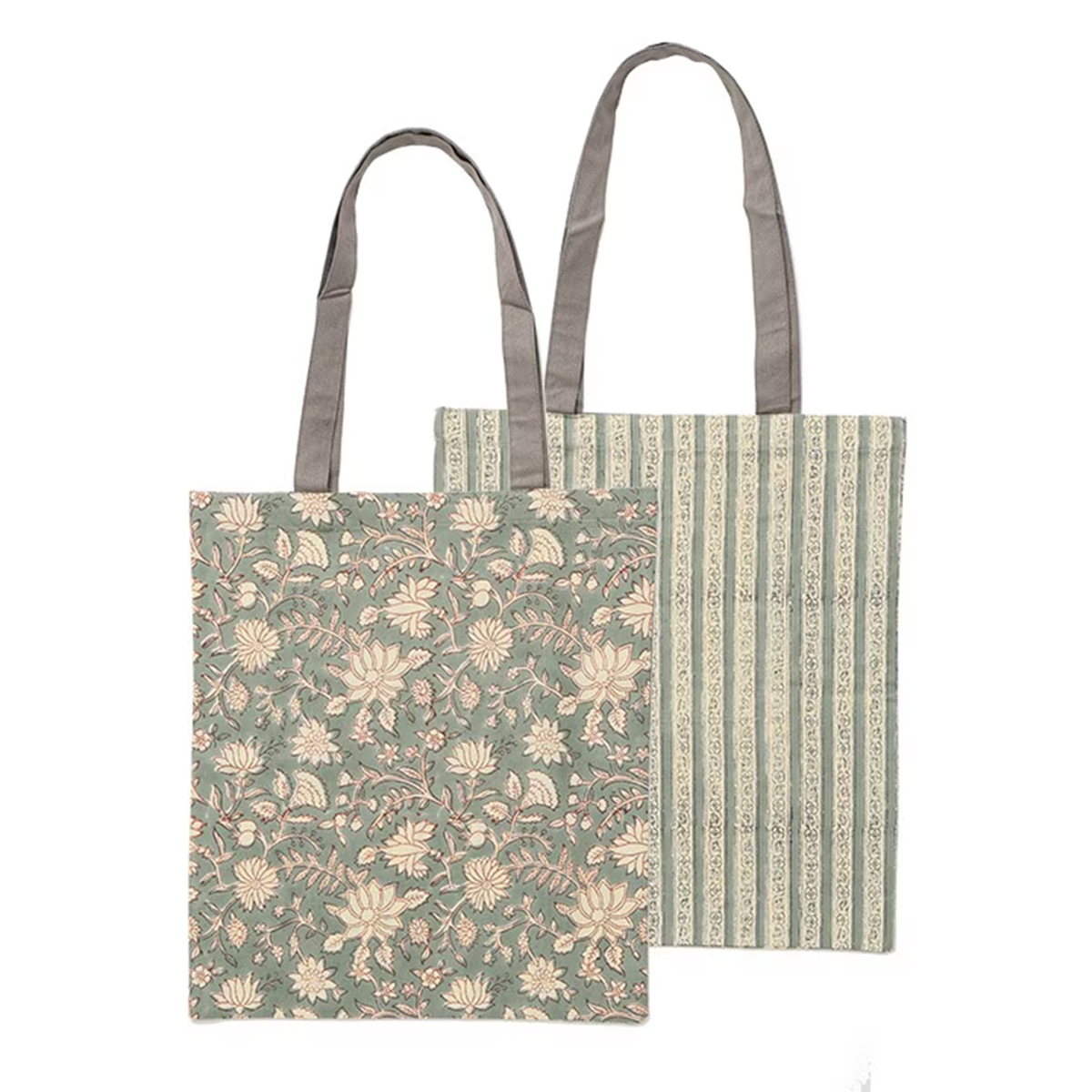 今期はお部屋のインテリアにも馴染みやすい落ち着いた色味を基調としながら、無地の配色がアクセントになったデザインになっています。両面で異なる柄を使ったトートバッグ。取っ手部分の色使いにもこだわっています。生地は薄めに作ってあるので、いざという時用に畳んでバッグにいれておいても邪魔になりません。エコバッグとして使ってみるのもおすすめです。