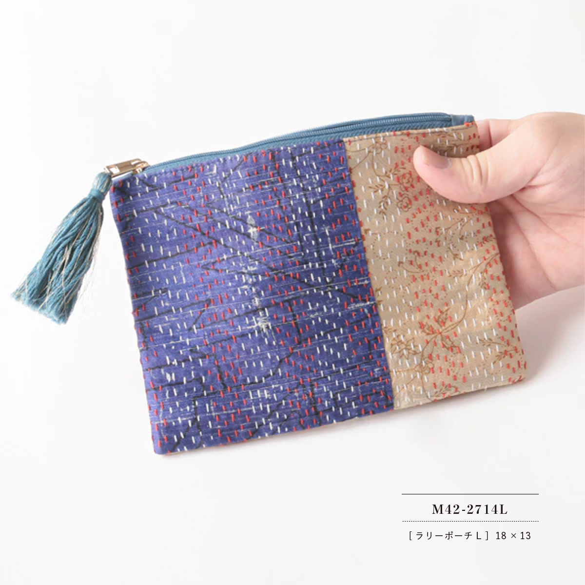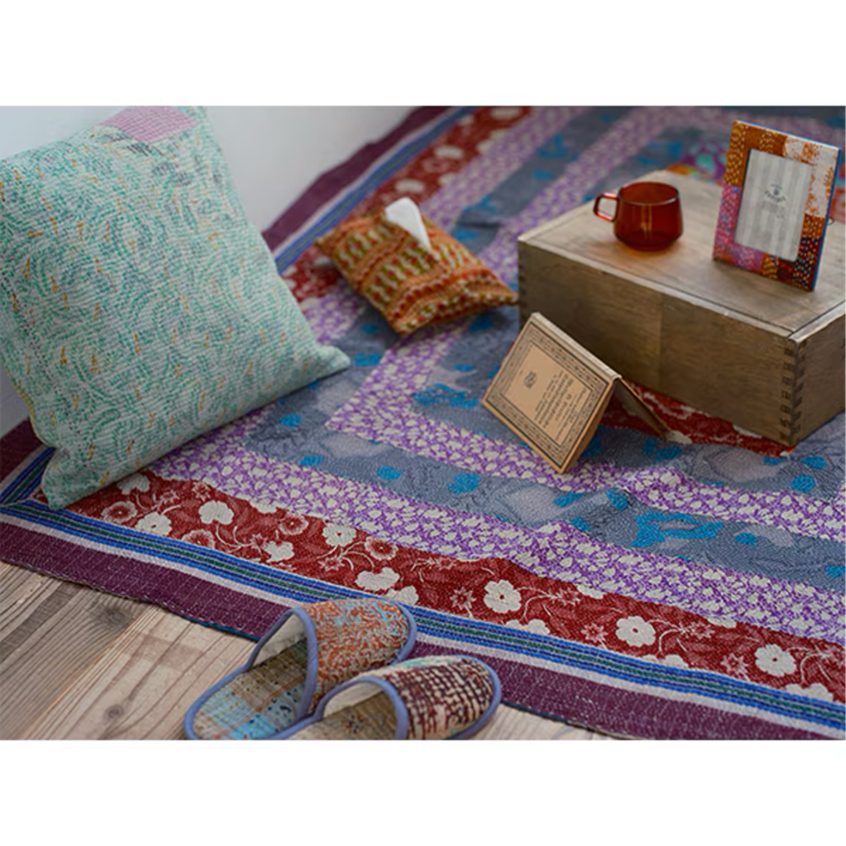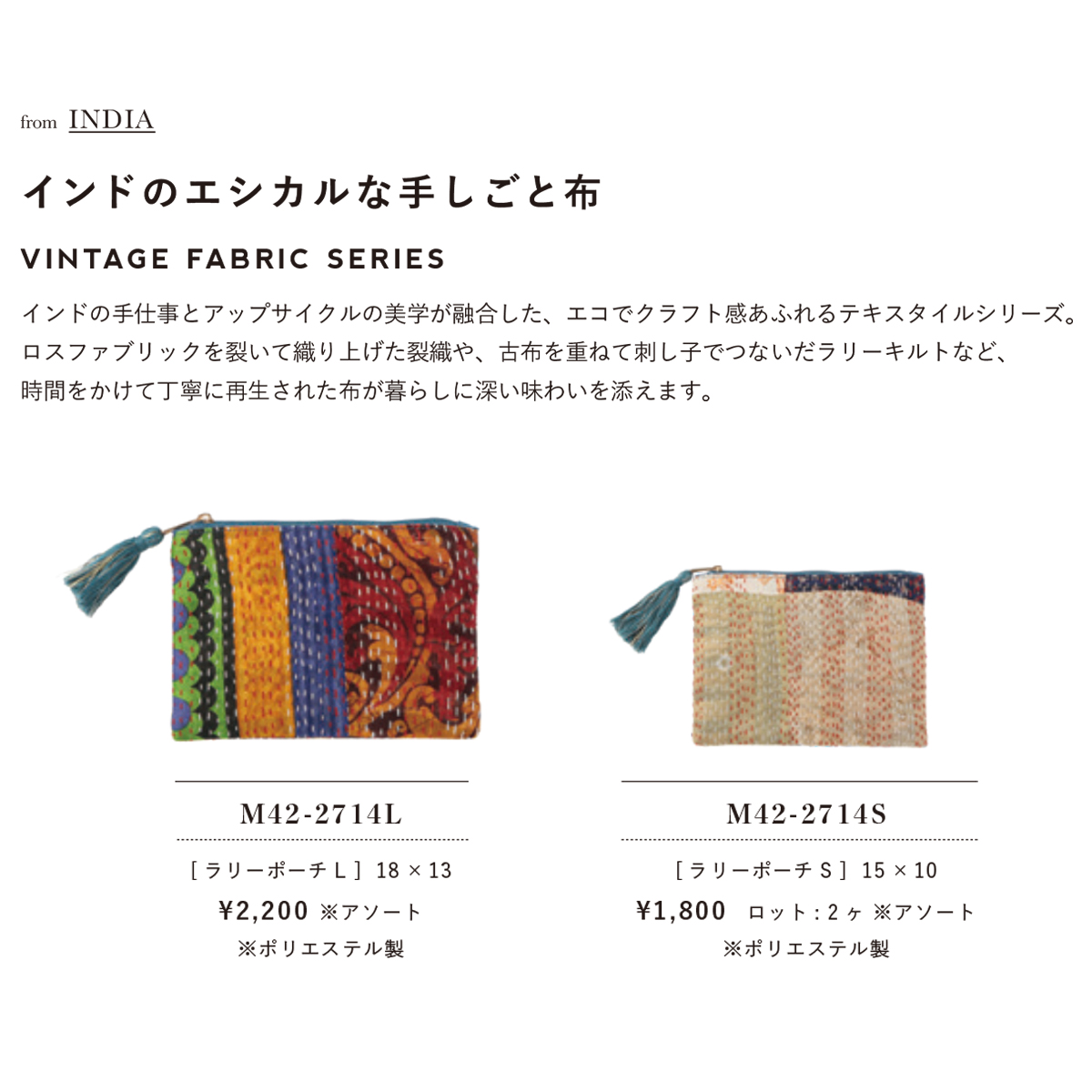 インドの昔ながらのエコロジー布である刺子を施したラリーキルトや先織り布を使用した小物雑貨のシリーズ。全てアソート生地の一点ものになります。毎回変わる生地の出会いをお楽しみください。素材を大切に再利用した味わい深い品々です。