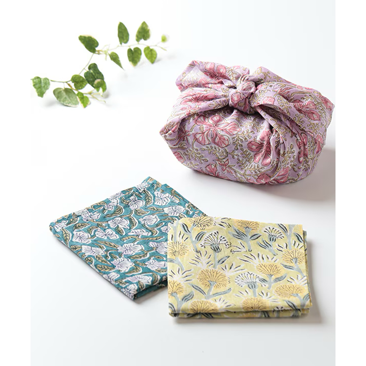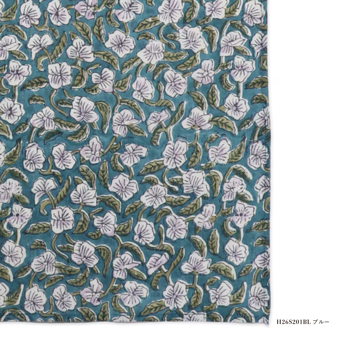 丈夫でハリのあるインドコットン素材。プレゼントにもおすすめです。ブロックプリントは熟練の職人が木版を使って丁寧に布にインクを乗せる作業を繰り返して仕上げられます。カスレや版の微妙な重なりの違いにより独特のニュアンスが生まれる、伝統的な手仕事ならではの味がある魅力的なテキスタイルです。