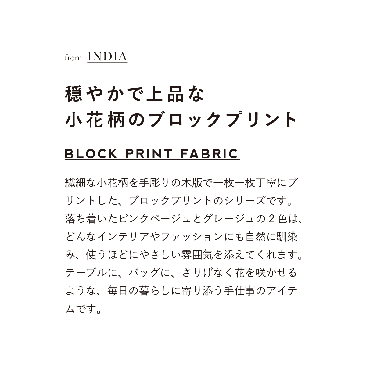 繊細な小花柄を手彫りの木版で一枚一枚丁寧にプリントした、ブロックプリントのシリーズです。