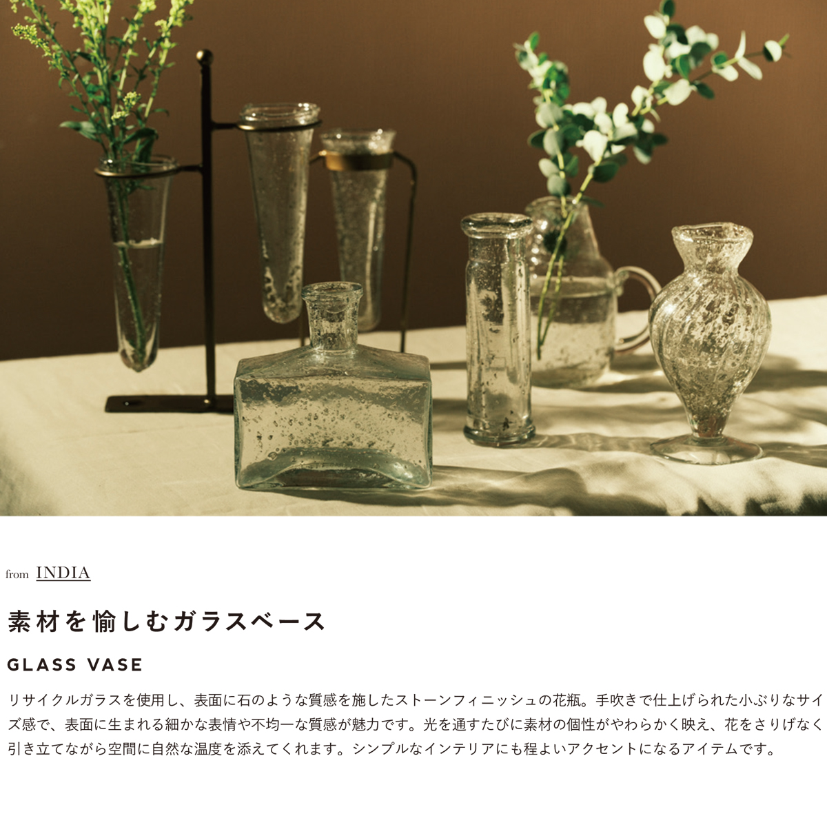 手吹きで仕上げられた小ぶりなサイズ感で、表面に生まれる細かな表情や不均一な質感が魅力です。光を通すたびに素材の個性がやわらかく映え、花をさりげなく引き立てながら空間に自然な温度を添えてくれます。シンプルなインテリアにも程よいアクセントになるアイテムです。