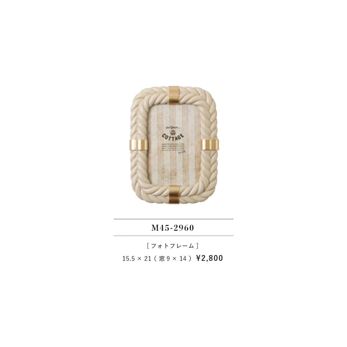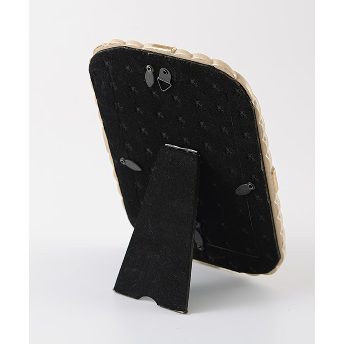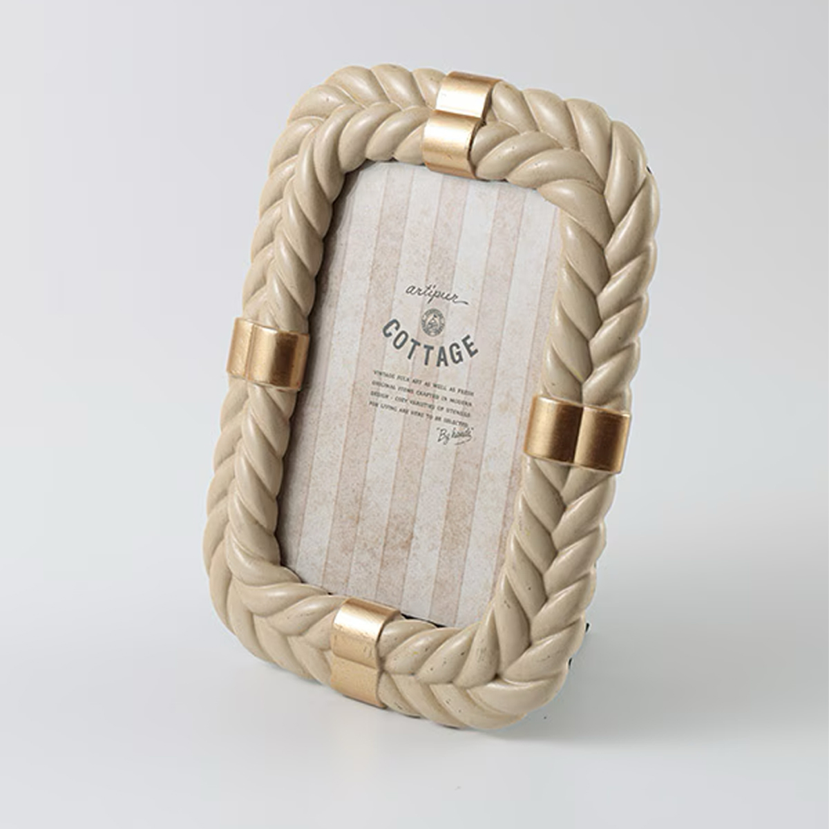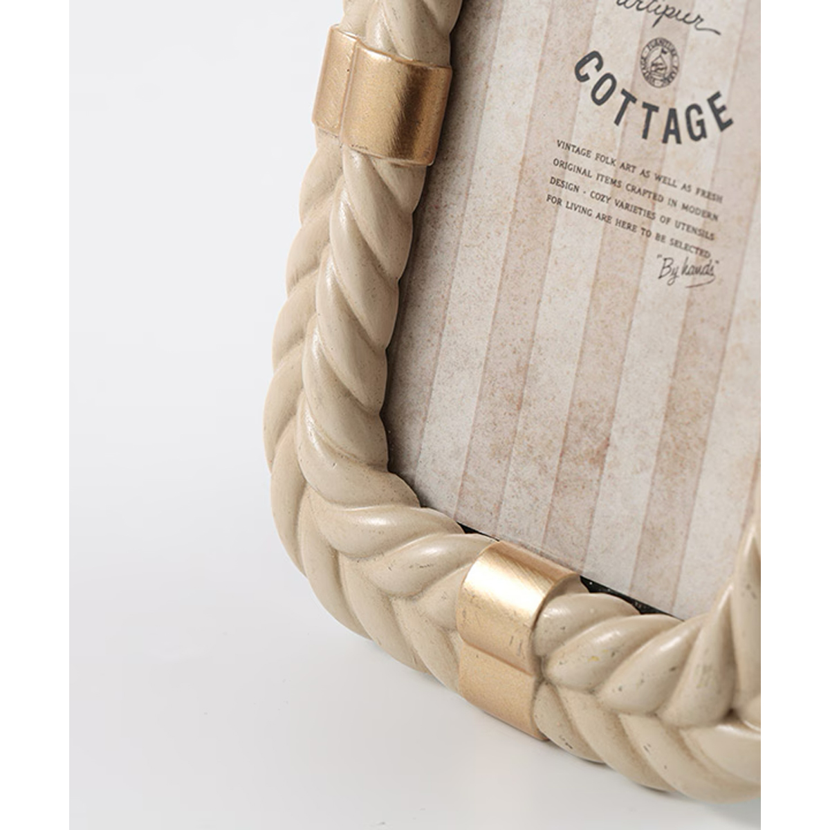 やさしい白とゴールドのアンティークカラーが魅力のレジン製のフォトフレーム。編み込んだような装飾のクラシカルな雰囲気が写真やポストカードを引き立てます。インテリアのアクセントとしてもギフトとしてもぴったりのアイテムです。