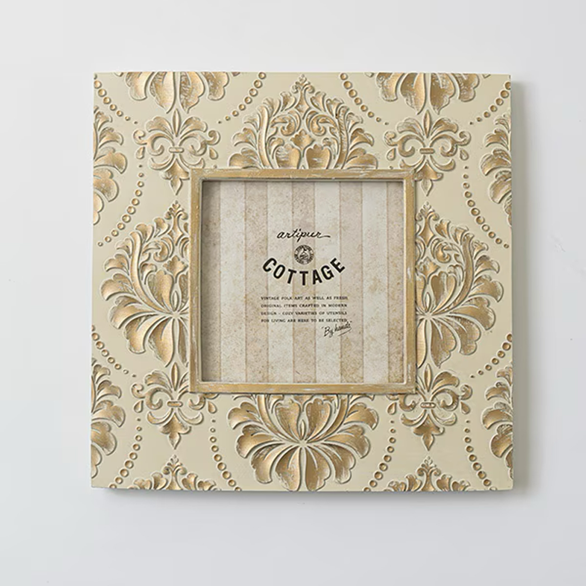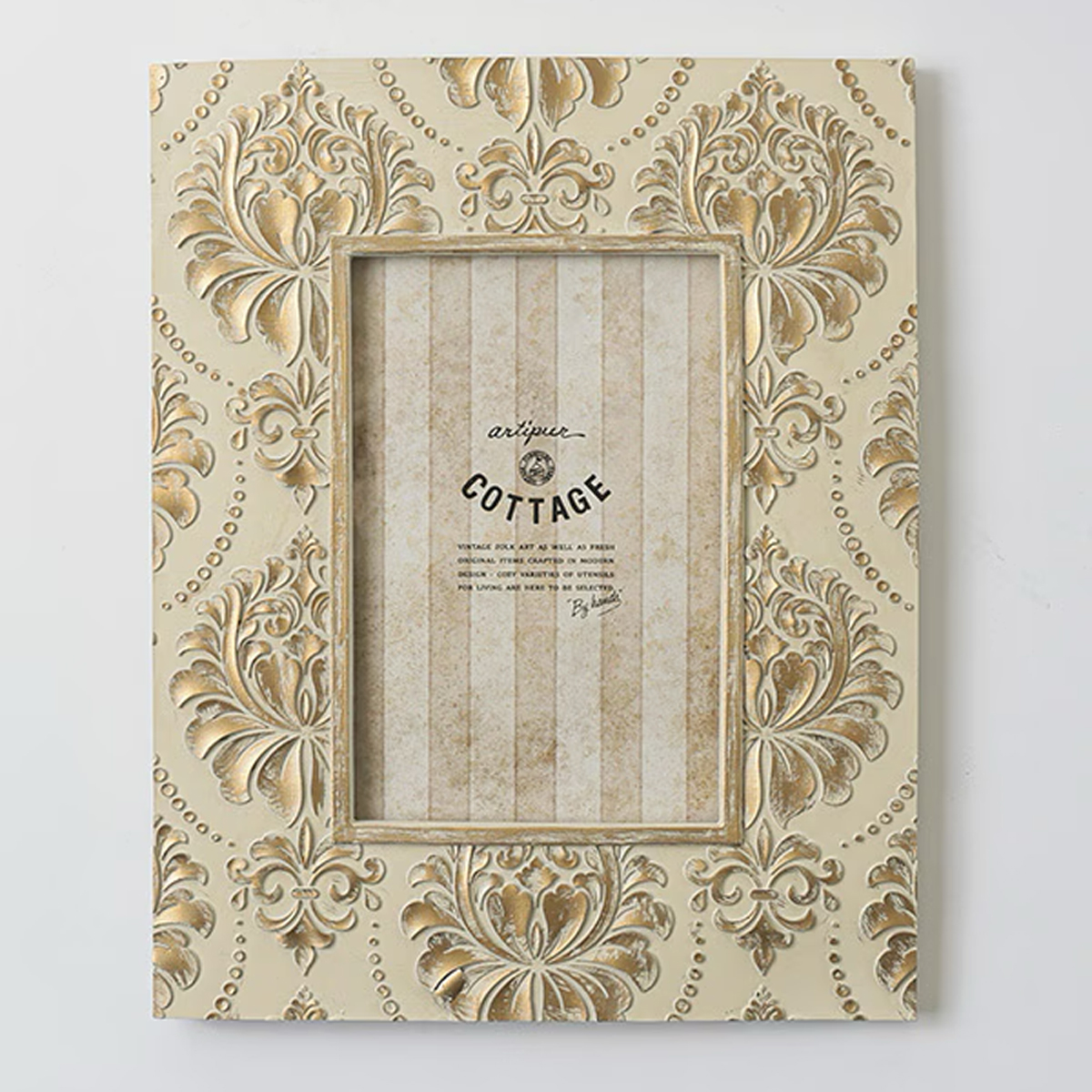 やさしいアイボリーとゴールドのアンティークカラーが魅力のレジン製のラージサイズのフォトフレーム。