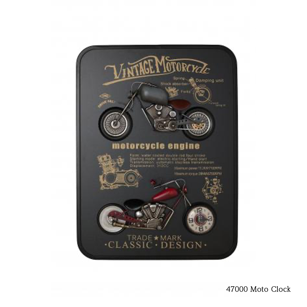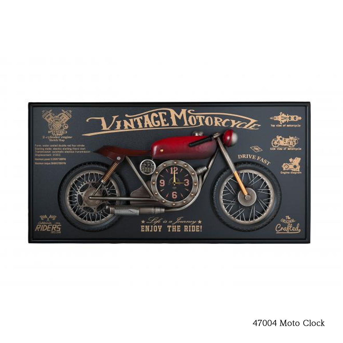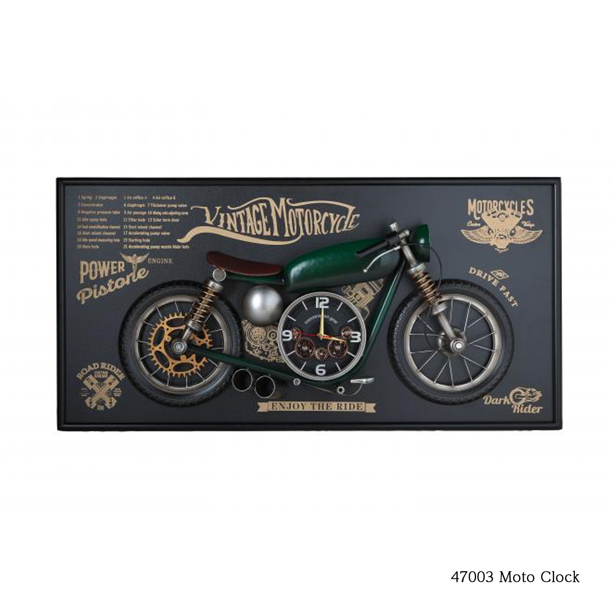 ヴィンテージモーターサイクルをモチーフにしたウォールクロックです。鉄製バイクオブジェと時計を組み合わせたインテリア壁掛け時計です。