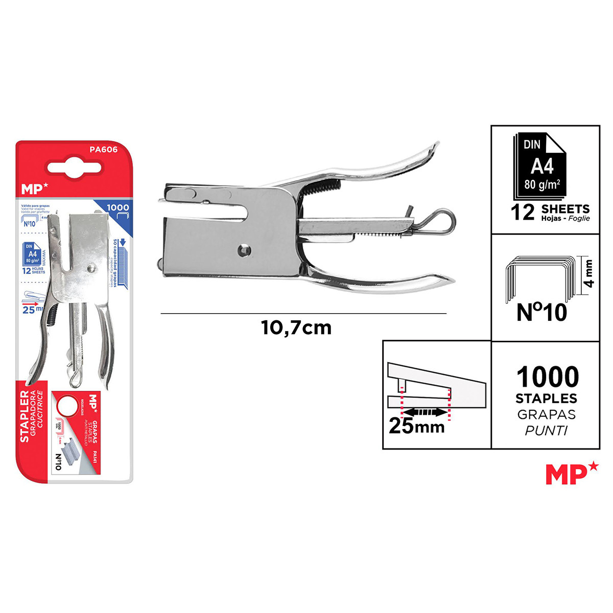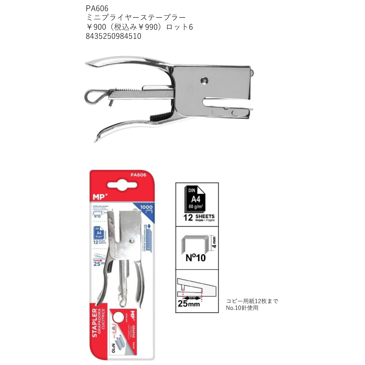 No.10針使用、コピー用紙12枚までとじられるミニプライヤータイプのステープラーです。