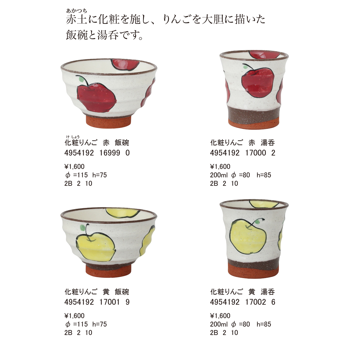 赤土に化粧を施し、りんごを大胆に描いた飯碗と湯呑です。