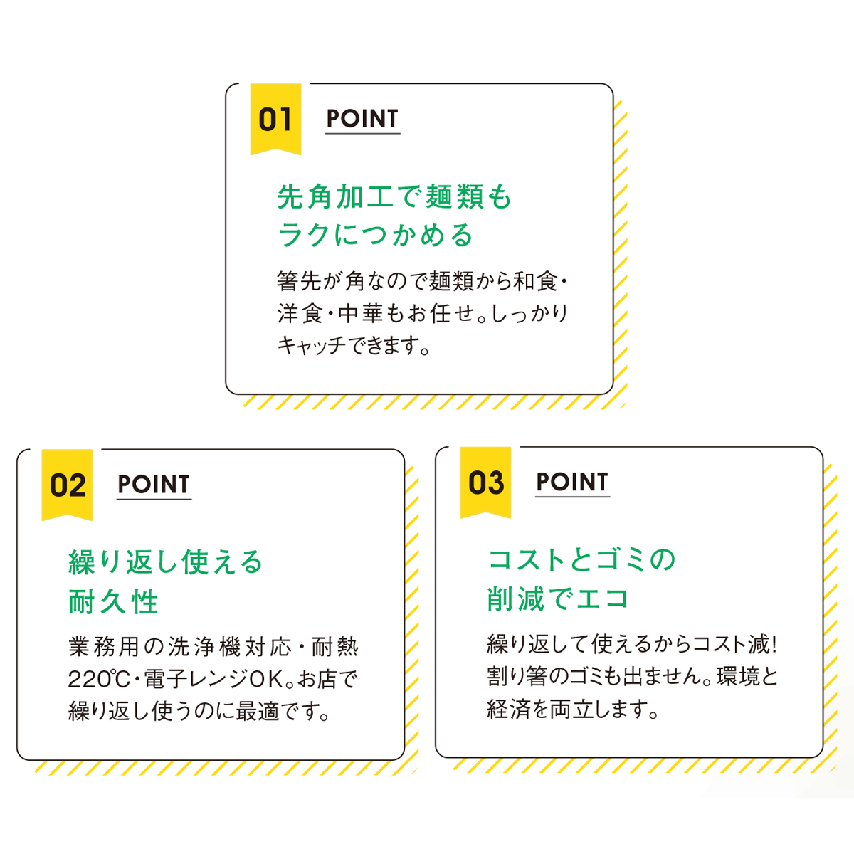 繰り返して使えるからコスト減! 割り箸のゴミも出ません。環境と経済を両立します。