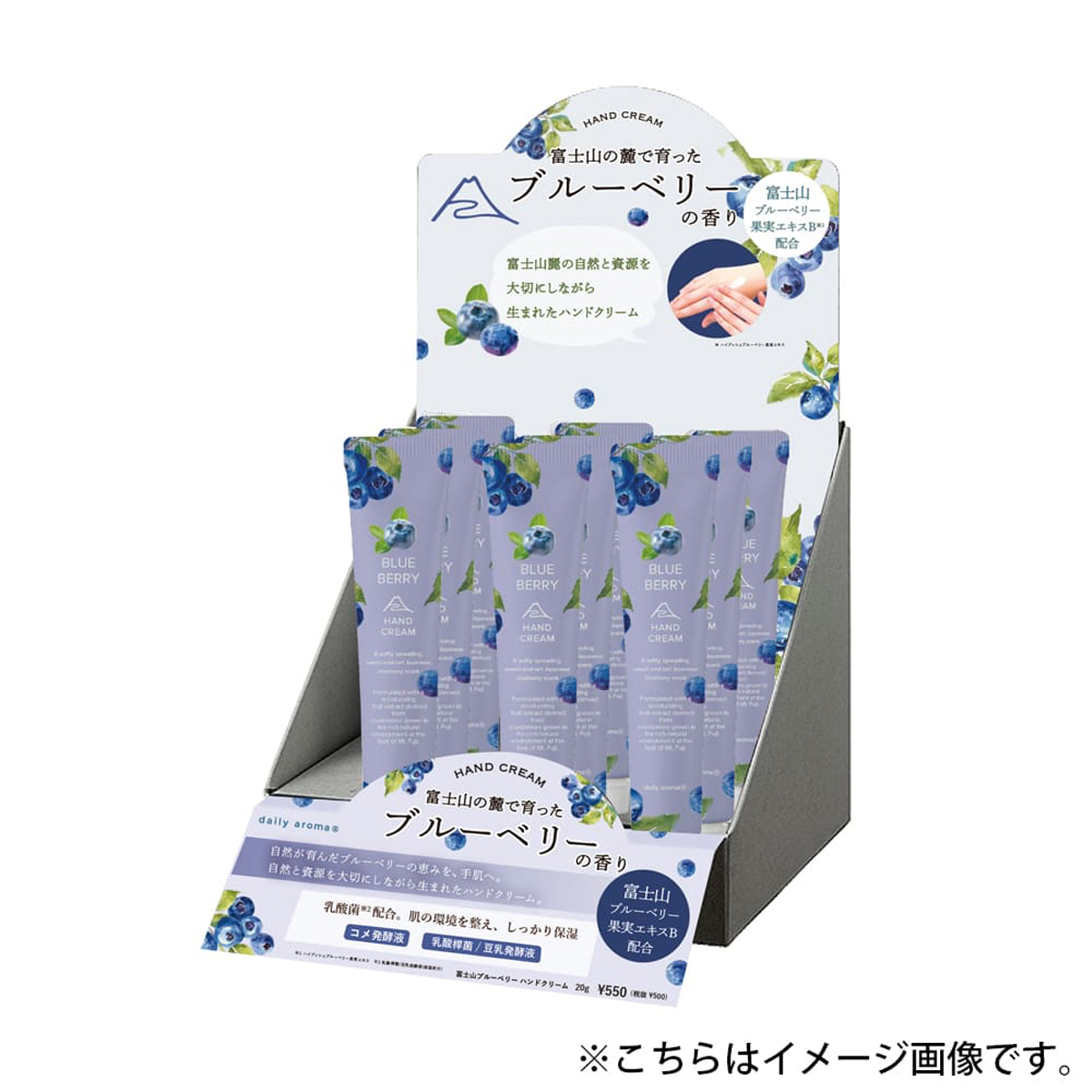 手にのばすたび、富士山の風景を思わせるようなみずみずしい香りがふわりと広がる、やさしい使い心地のブルーベリーハンドクリームです。