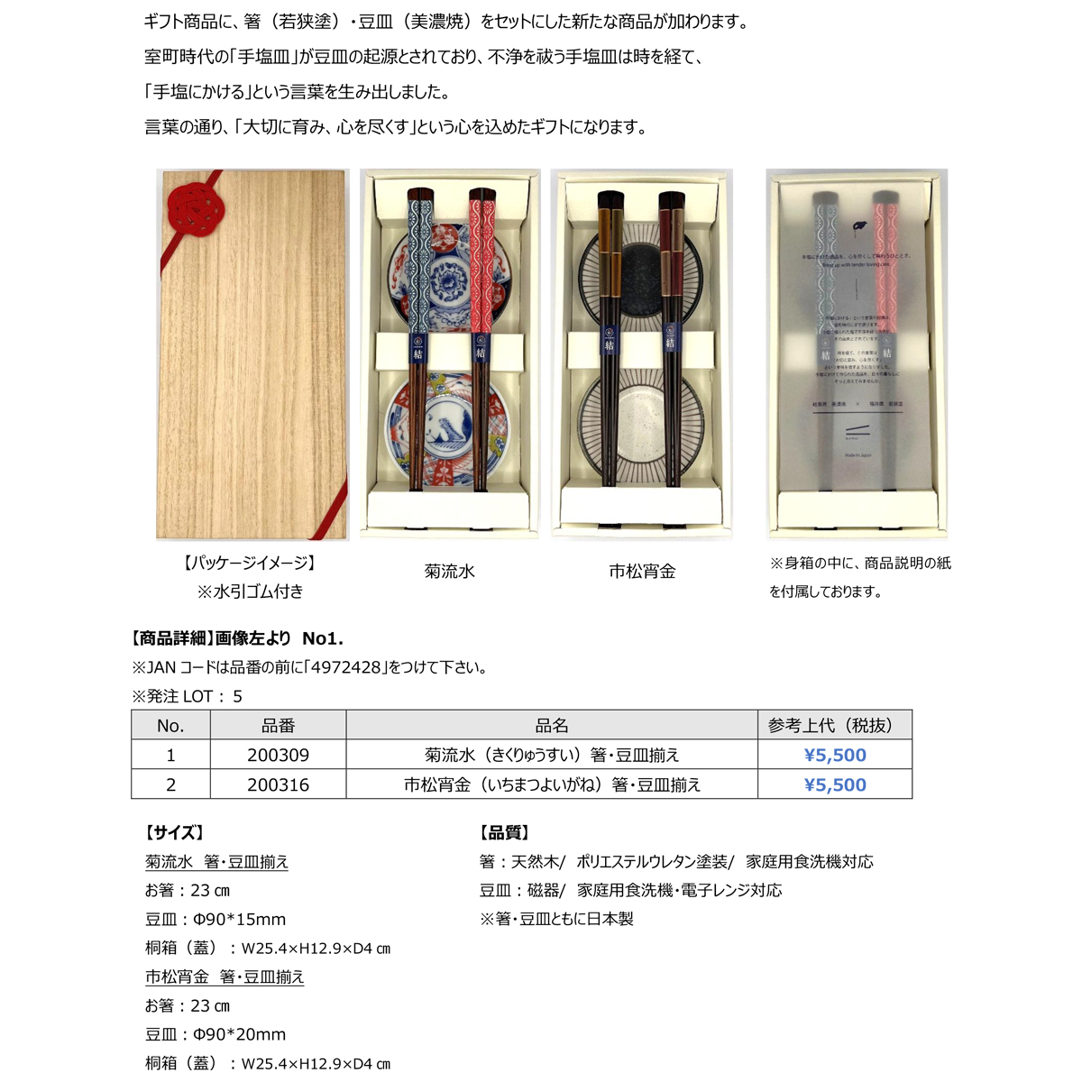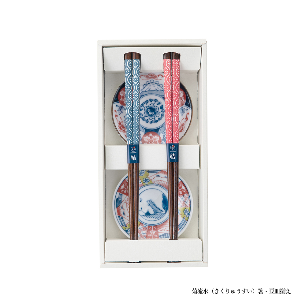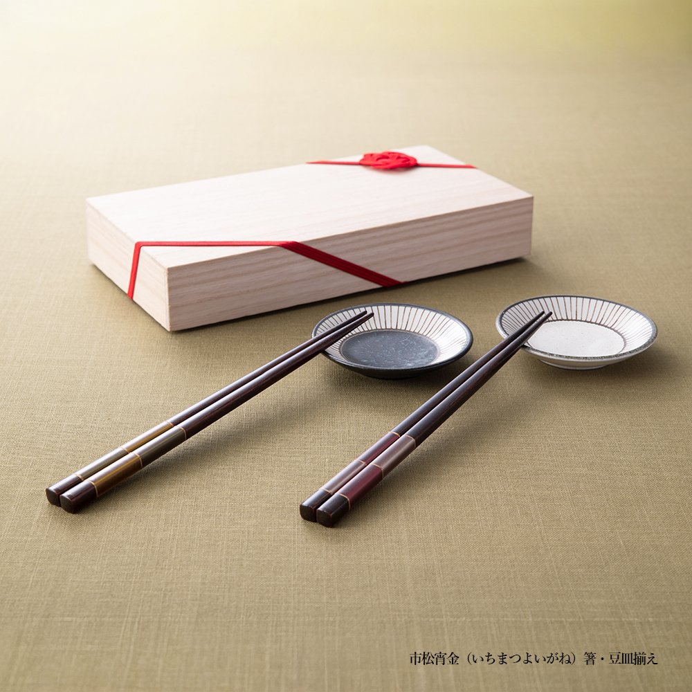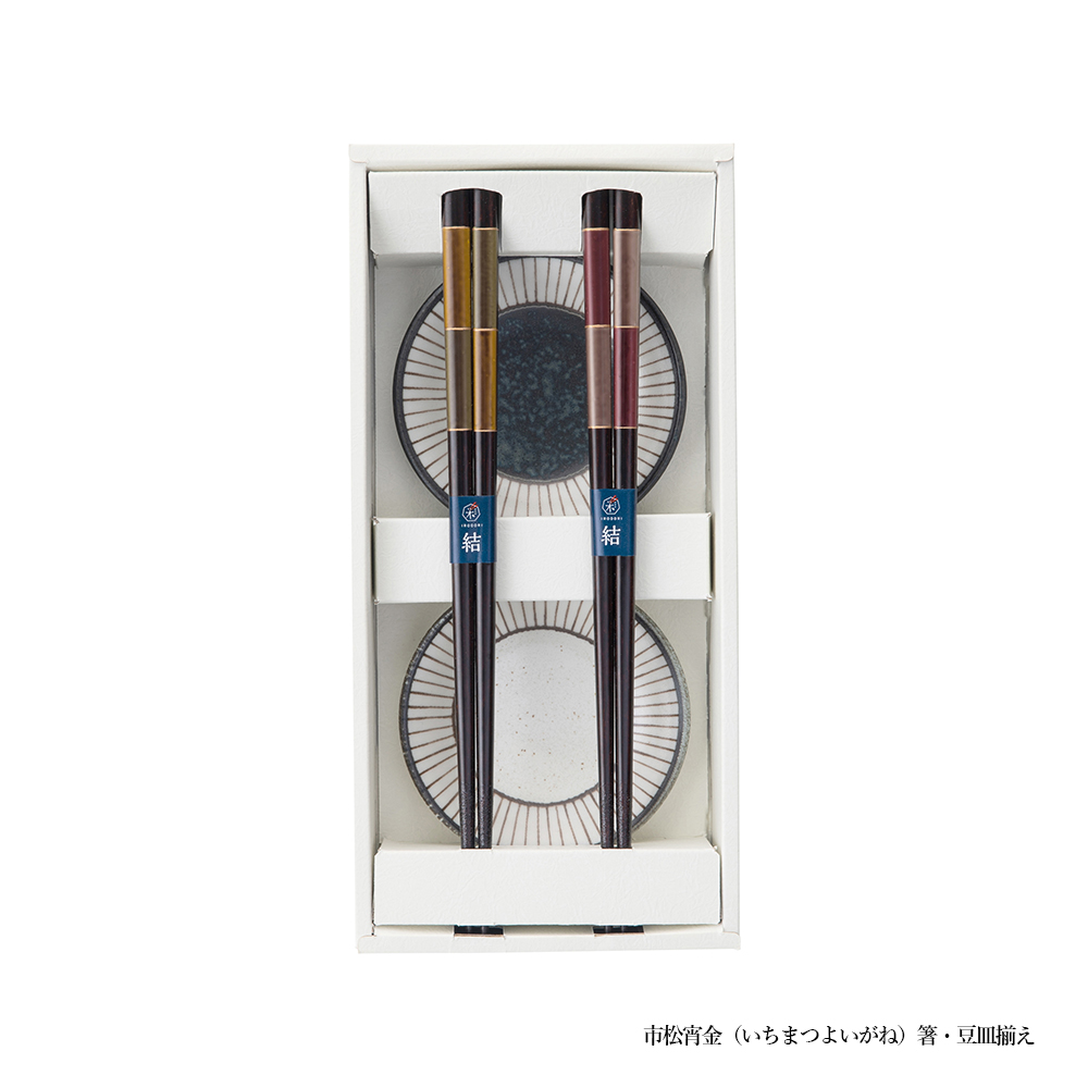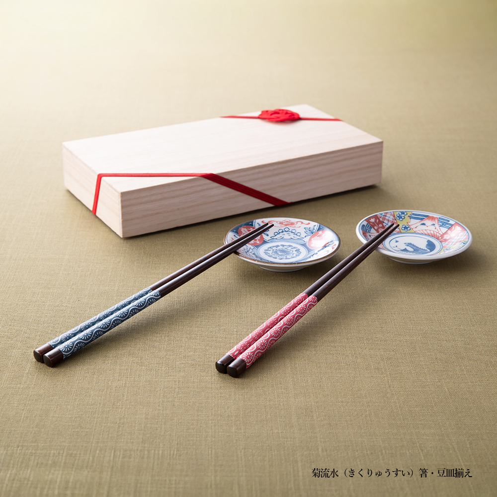 ギフト商品に、箸(若狭塗)・豆皿(美濃焼)をセットにした新たな商品が加わります。室町時代の「手塩皿」が豆皿の起源とされており、不浄を祓う手塩皿は時を経て、「手塩にかける」という言葉を生み出しました。言葉の通り、「大切に育み、心を尽くす」という心を込めたギフトになります。