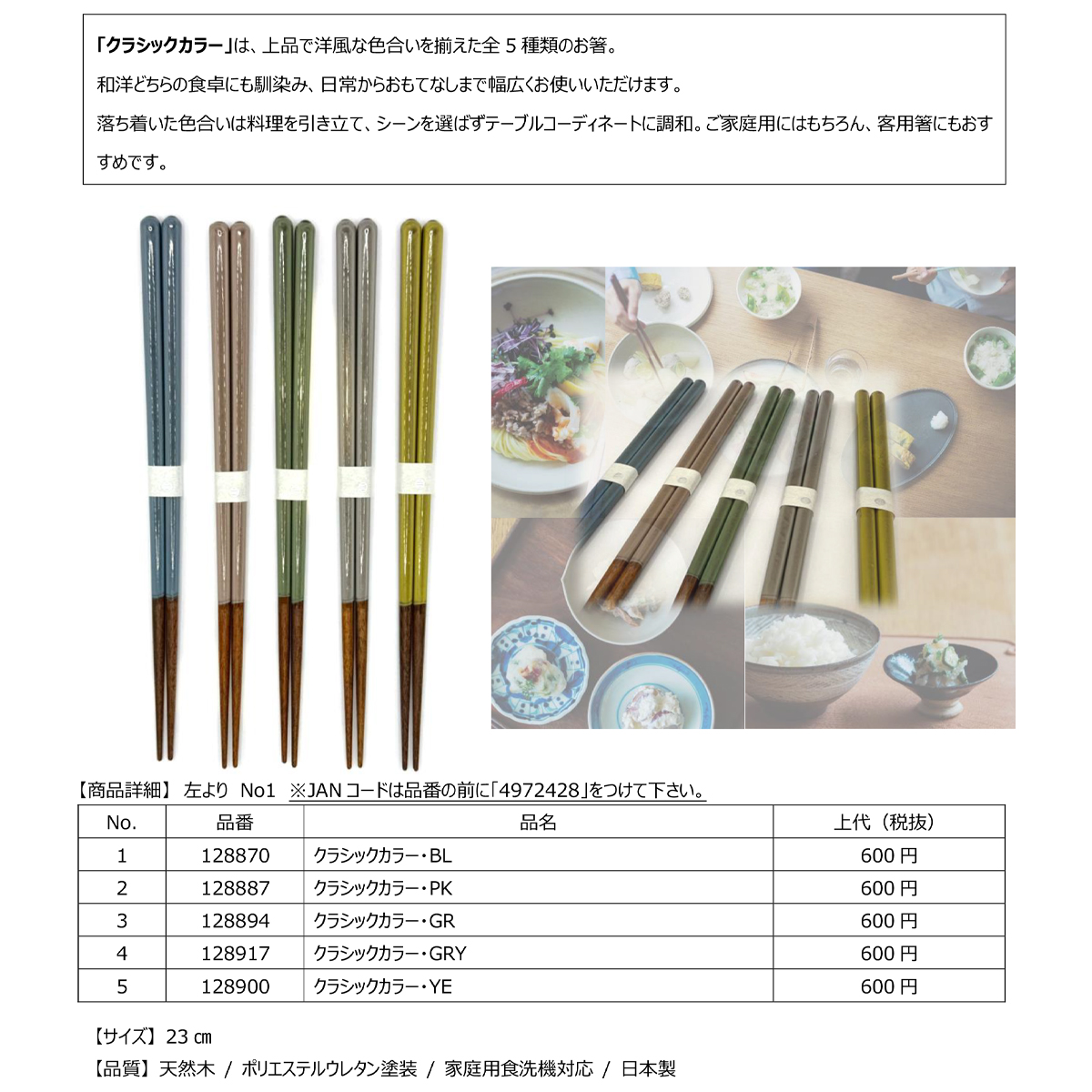 クラシックカラー 箸23cm 客用箸としても 全5色