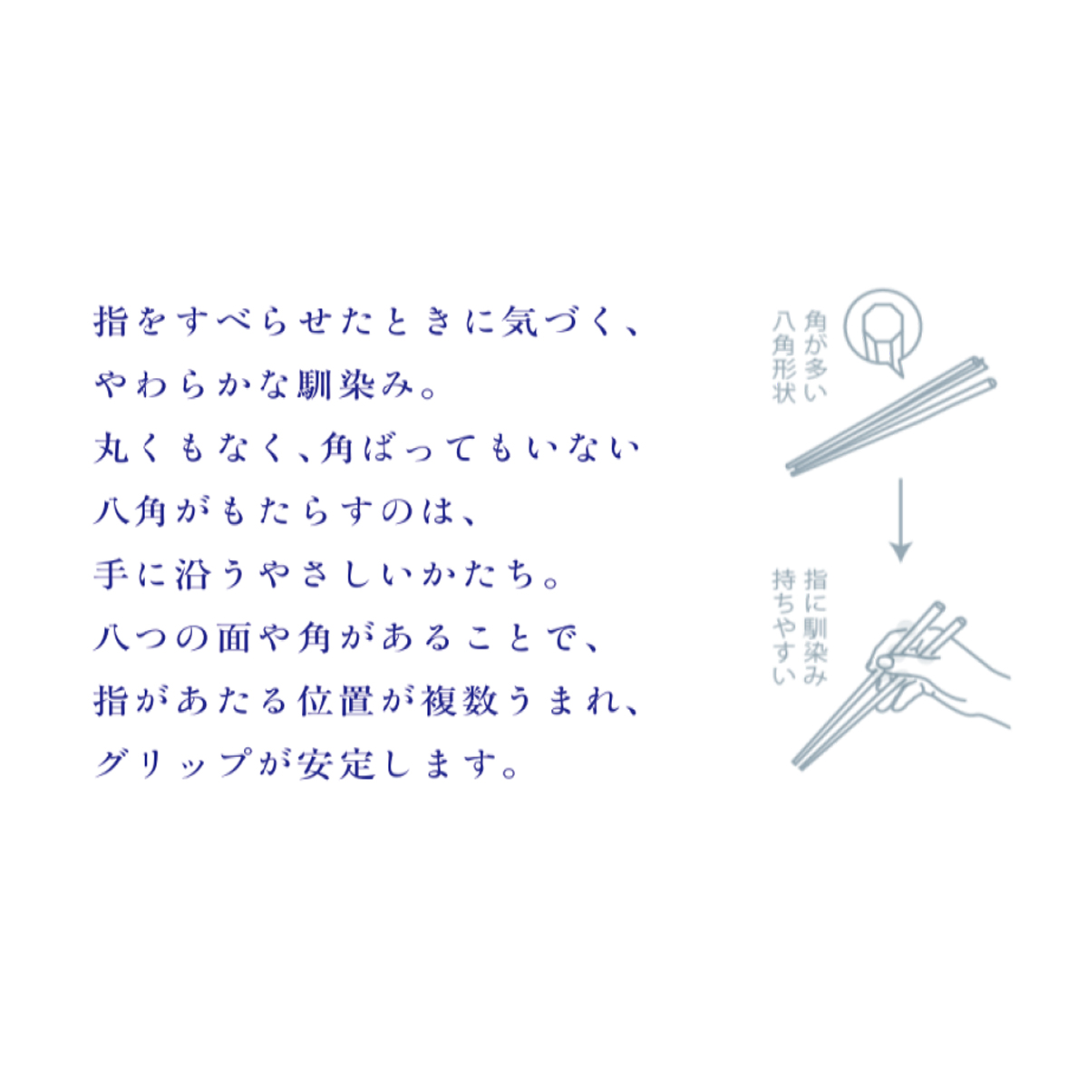 指をすべらせたときに気づく、やわらかな馴染み。丸くもなく、角ばってもいない八角がもたらすのは、手に沿うやさしいかたち。八つの面や角があることで、指があたる位置が複数うまれ、グリップが安定します。